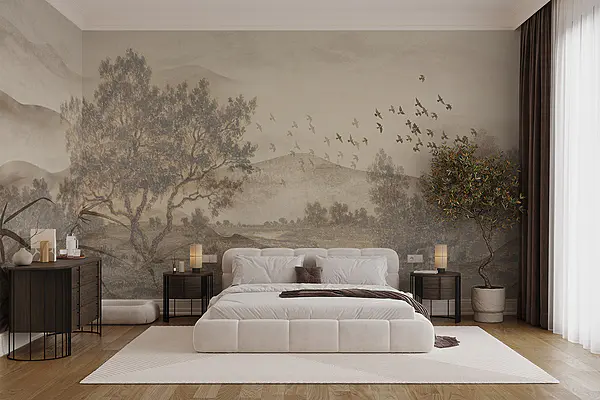 Wybierz jasne brzozy lub mglisty pejzaż. Dodaj ciepłe oświetlenie i lustra. Efekt będzie lekki i świeży.
