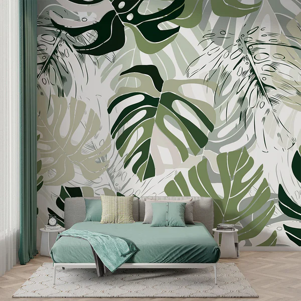 Fototapeta Zielone liście na tle teksturowanej ściany