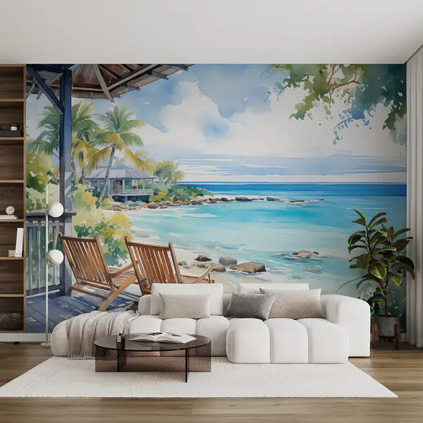 Fototapeta Akwarela przedstawiająca zachód słońca nad zbiornikiem wodnym