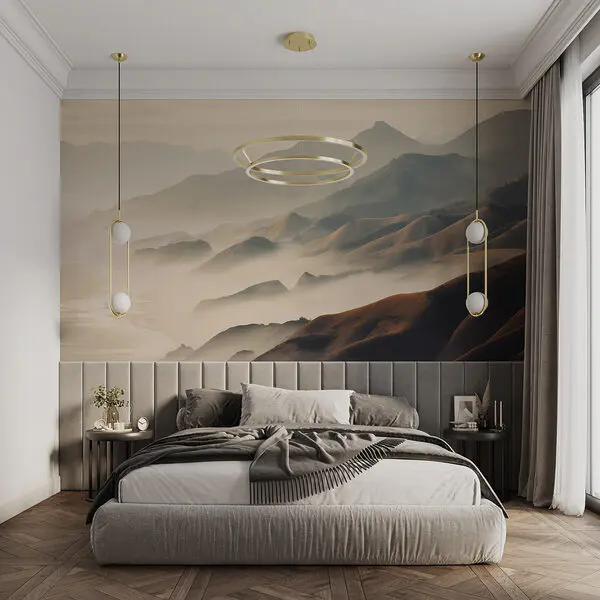 Fototapeta Mglisty krajobraz z górami i drzewami