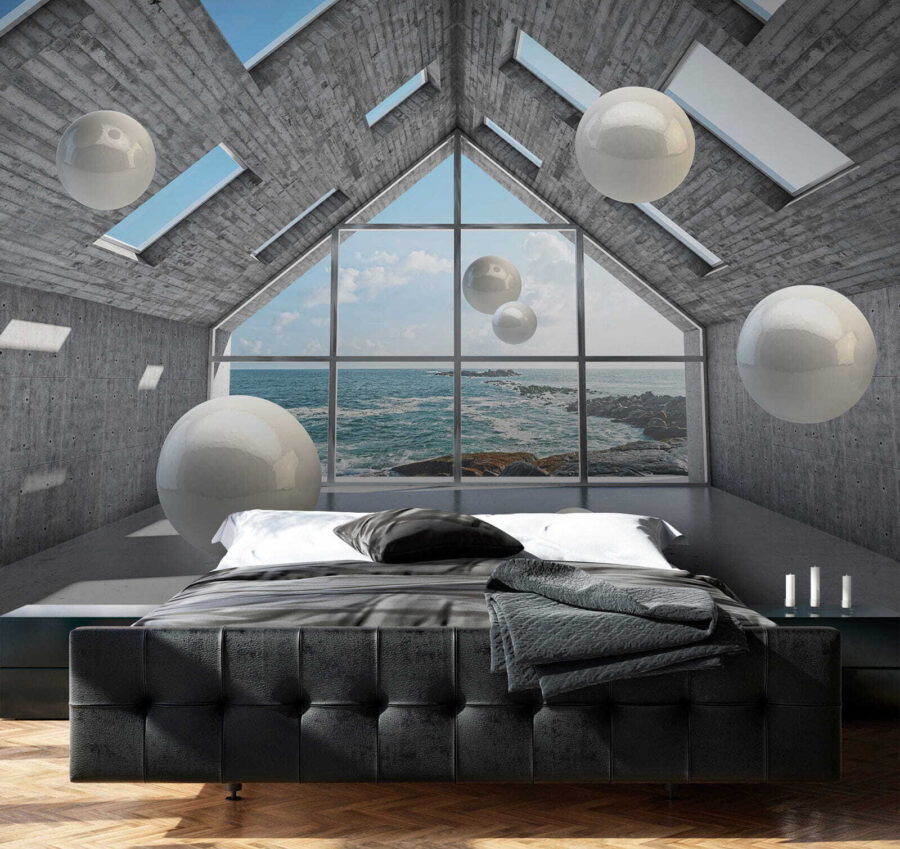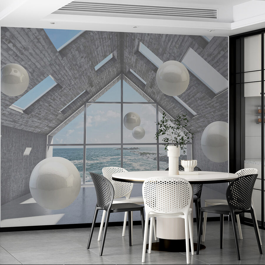 Przekształć swoją przestrzeń w senną ucieczkę dzięki tej fototapecie przedstawiającej białą kulę unoszącą się w betonowym pomieszczeniu. To jak wejście do instalacji artystycznej bez opuszczania domowego zacisza. Wyobraź sobie siebie popijającego kawę, zagubionego w myślach, podczas gdy te eleganckie kule zdają się tańczyć wokół ciebie. Połączenie nowoczesnego, industrialnego wyglądu z hipnotyzującym widokiem na morze tworzy chłodną atmosferę. To idealne miejsce na pobudzenie kreatywności lub po prostu chwilę oddechu. Niezależnie od tego, czy jest to przytulny salon, czy eleganckie biuro, ta fototapeta zachęca do ciekawości i rozmowy, sprawiając, że każda ściana ożywa. Poczuj ten klimat!