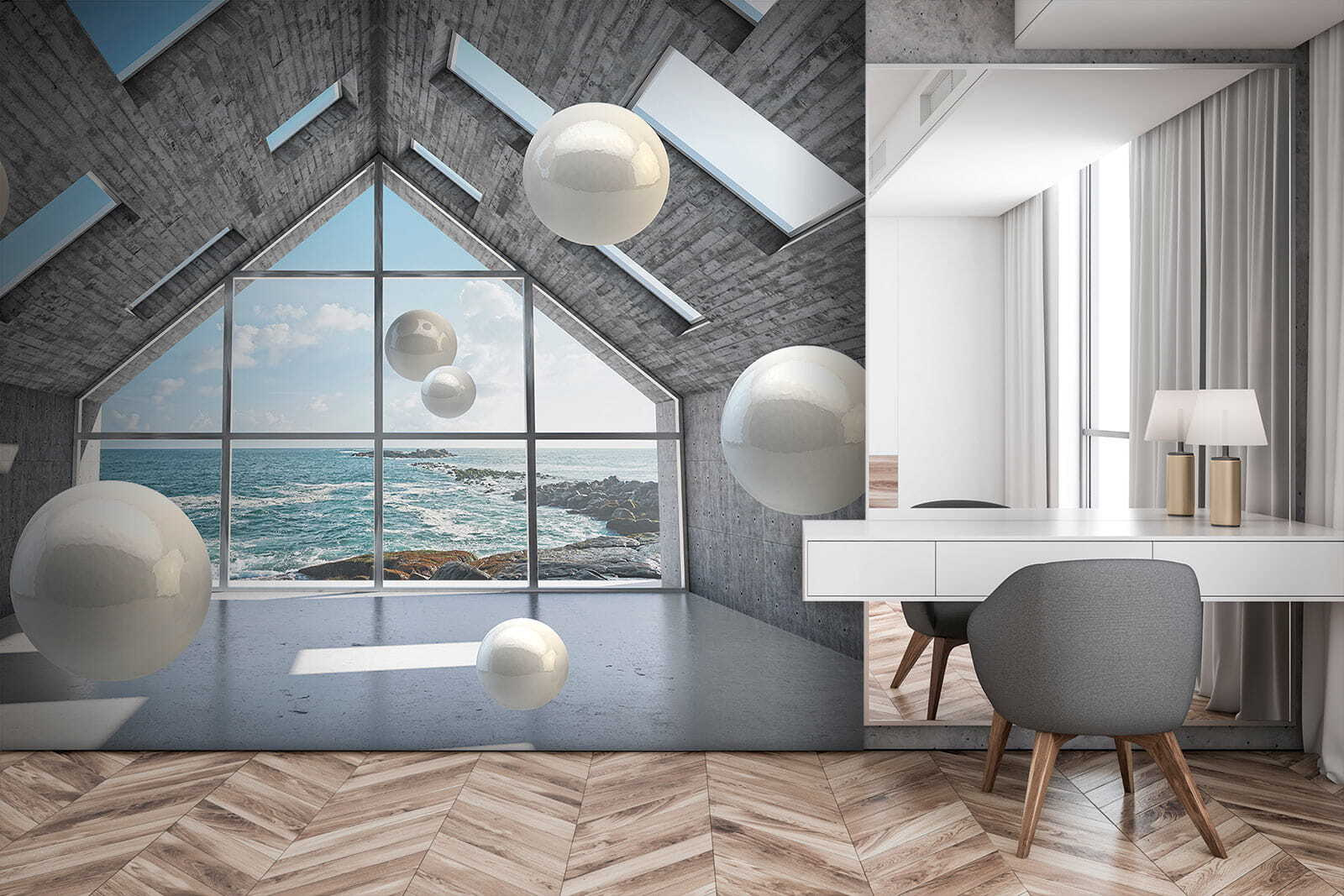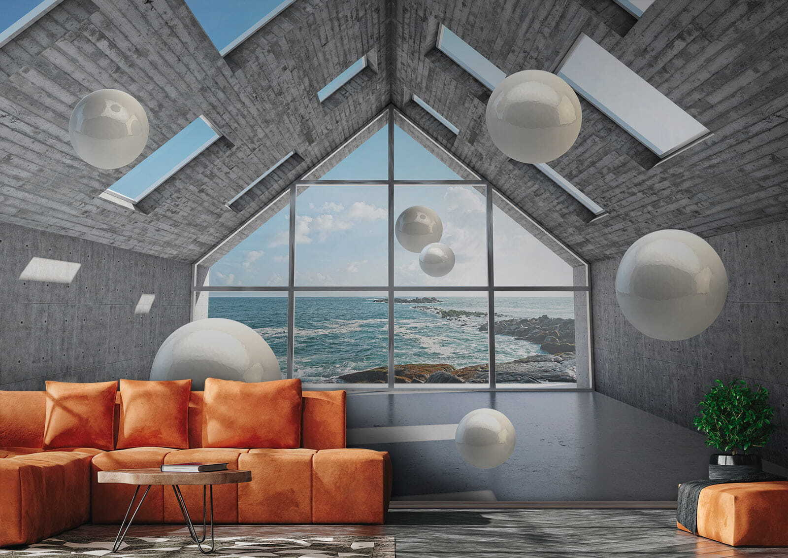 Przekształć swoją przestrzeń w senną ucieczkę dzięki tej fototapecie przedstawiającej białą kulę unoszącą się w betonowym pomieszczeniu. To jak wejście do instalacji artystycznej bez opuszczania domowego zacisza. Wyobraź sobie siebie popijającego kawę, zagubionego w myślach, podczas gdy te eleganckie kule zdają się tańczyć wokół ciebie. Połączenie nowoczesnego, industrialnego wyglądu z hipnotyzującym widokiem na morze tworzy chłodną atmosferę. To idealne miejsce na pobudzenie kreatywności lub po prostu chwilę oddechu. Niezależnie od tego, czy jest to przytulny salon, czy eleganckie biuro, ta fototapeta zachęca do ciekawości i rozmowy, sprawiając, że każda ściana ożywa. Poczuj ten klimat!