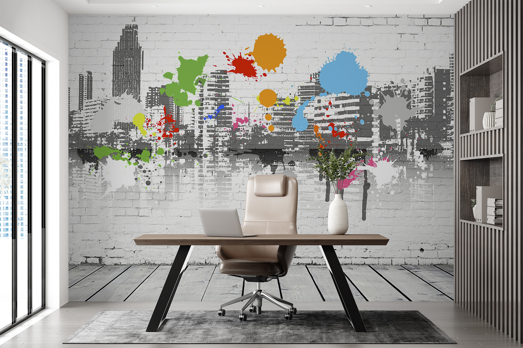 Ta fototapeta całkowicie odmieni każdą przestrzeń! Nazywa się “Niebieska plama na białej ceglanej ścianie”, ale robi znacznie więcej niż tylko dodaje odrobinę koloru. Wyobraź sobie, że budzisz się każdego dnia – jasne, zabawne plamy niebieskiego, zielonego i innych żywych kolorów na tle chłodnej sylwetki pejzażu miejskiego. To tak, jakby dać swojemu pokojowi przypływ kreatywnej energii bez bałaganu!