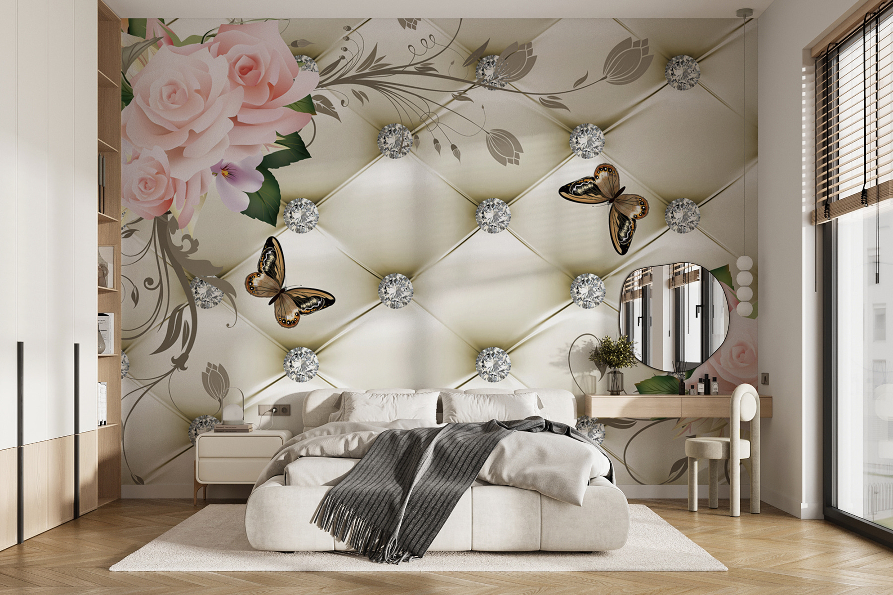 Przekształć dowolny pokój w przytulną oazę dzięki tej zachwycającej fototapecie z różami i motylami. Wyobraź sobie, że wchodzisz do swojego pokoju i codziennie czujesz delikatny powiew wiosny – kto by tego nie chciał? Delikatne kolory i kapryśny design dodają uroku bez przytłaczania. Motyle wydają się fruwać, a delikatne kwiaty dodają odrobinę piękna natury. To jak przeniesienie ogrodu do domu, ale bez konewki! Idealny do salonu, sypialni, a nawet kącika zabaw. Wyobraź sobie popijanie herbaty przy tej fototapecie i poczuj się jak w uroczej małej kawiarni!