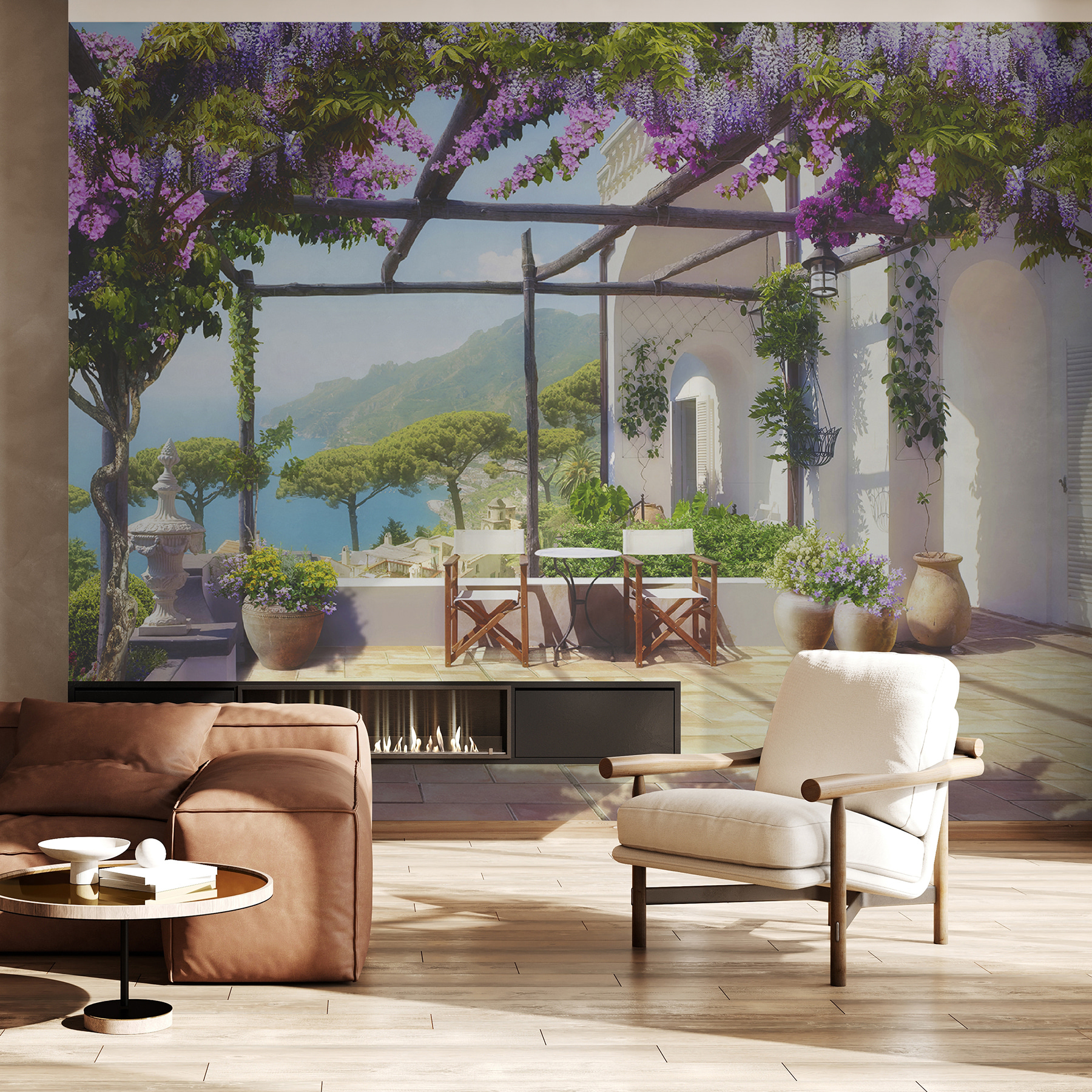 Idealna do rozjaśnienia każdej przestrzeni, ta fototapeta łączy klasyczną architekturę z pięknem natury. Niemal usłyszysz delikatny szelest liści i poczujesz ciepłą bryzę. Niezależnie od tego, czy jest to salon, czy przytulny kącik w kawiarni, ta fototapeta wprowadza zachęcającą, spokojną atmosferę… prawie tak, jakbyś przeniósł się do swojego ulubionego nadmorskiego miejsca. Te terakotowe doniczki, pełne kolorowych kwiatów, dodają idealnego uroku.