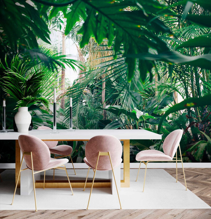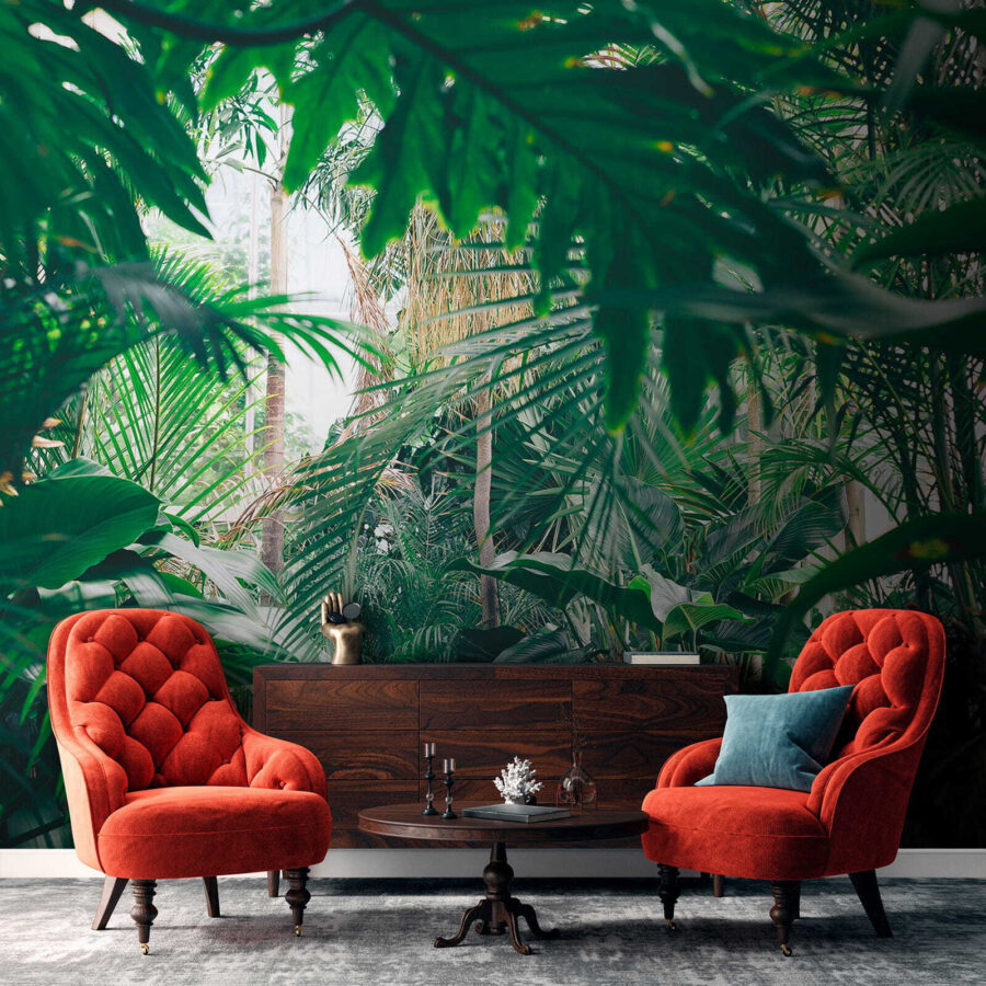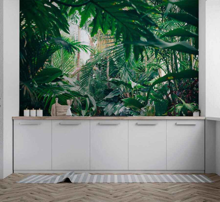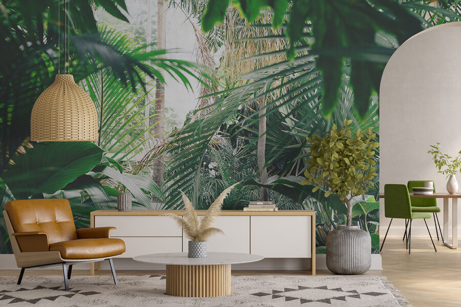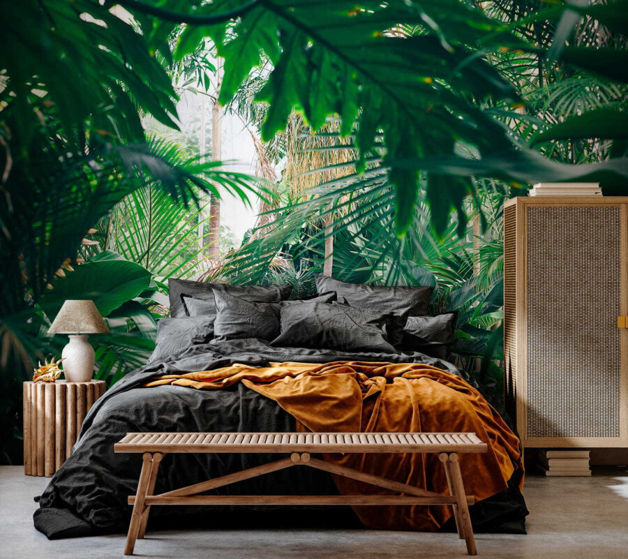 Przekształć dowolny pokój w tropikalny raj dzięki tej oszałamiającej fototapecie ściennej przedstawiającej bujne liście dżungli skąpane w słońcu. Wyobraź sobie, że wchodzisz do swojego pokoju i czujesz się, jakbyś wszedł bezpośrednio do spokojnej dżungli, gdzie powietrze jest świeże, a światło słoneczne przenika przez liście. To jak przeniesienie kawałka natury do wnętrza bez sprayu na owady! Idealny dla tych, którzy pragną odrobiny zieleni, ale nie mają zielonego kciuka. Znajomi pomyślą, że znalazłeś najlepsze miejsce na wakacje w domu. Wystarczy wyobrazić sobie przytulanie się z dobrą książką lub delektowanie się filiżanką kawy w otoczeniu tej tętniącej życiem ucieczki. To nie tylko fototapeta; to powiew świeżego powietrza dla twoich ścian!