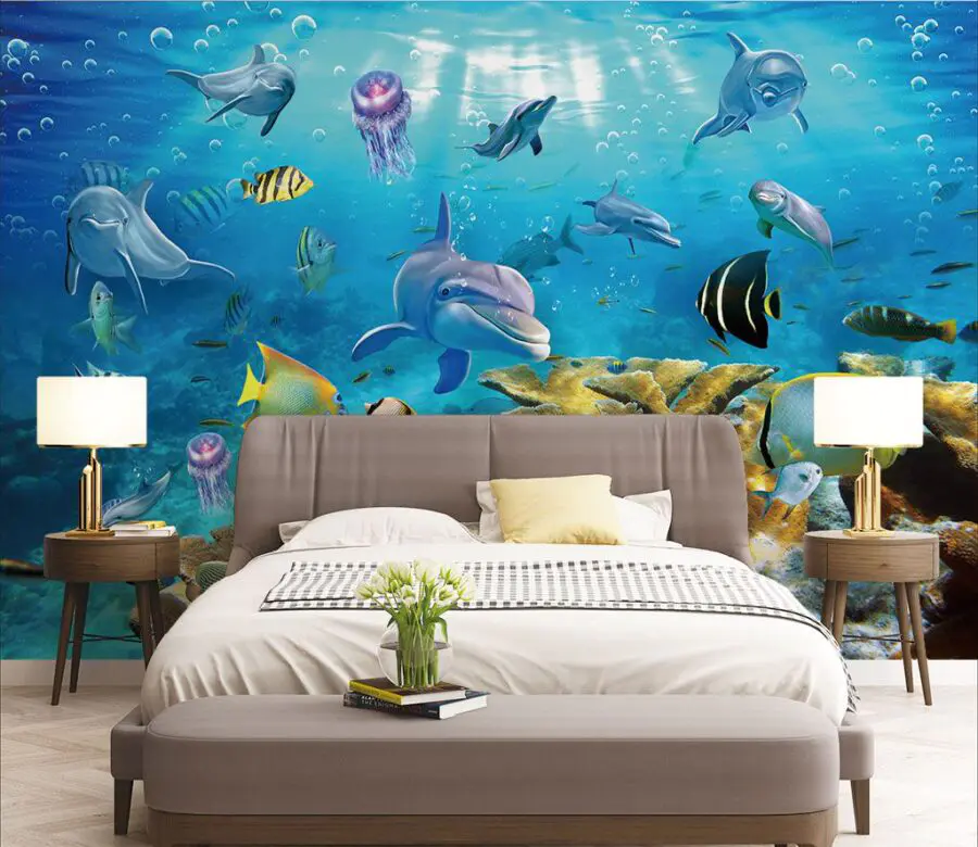 Dive into a world of color and charm with this delightful mural of a fishy paradise! Imagine walking into a room and instantly feeling like you’ve splashed into a serene underwater scene—bubbles floating, colorful fish darting by, and playful dolphins grinning at you. Perfect for a kid’s room or even that nook where creativity flows, this mural brings a splash of joy and a wave of calm. It’s like having your personal aquarium without the fuss of cleaning. Let your space swim in vibrant energy and watch the little ones giggle at their new underwater friends. Just be careful—you might start feeling a little fishy yourself!