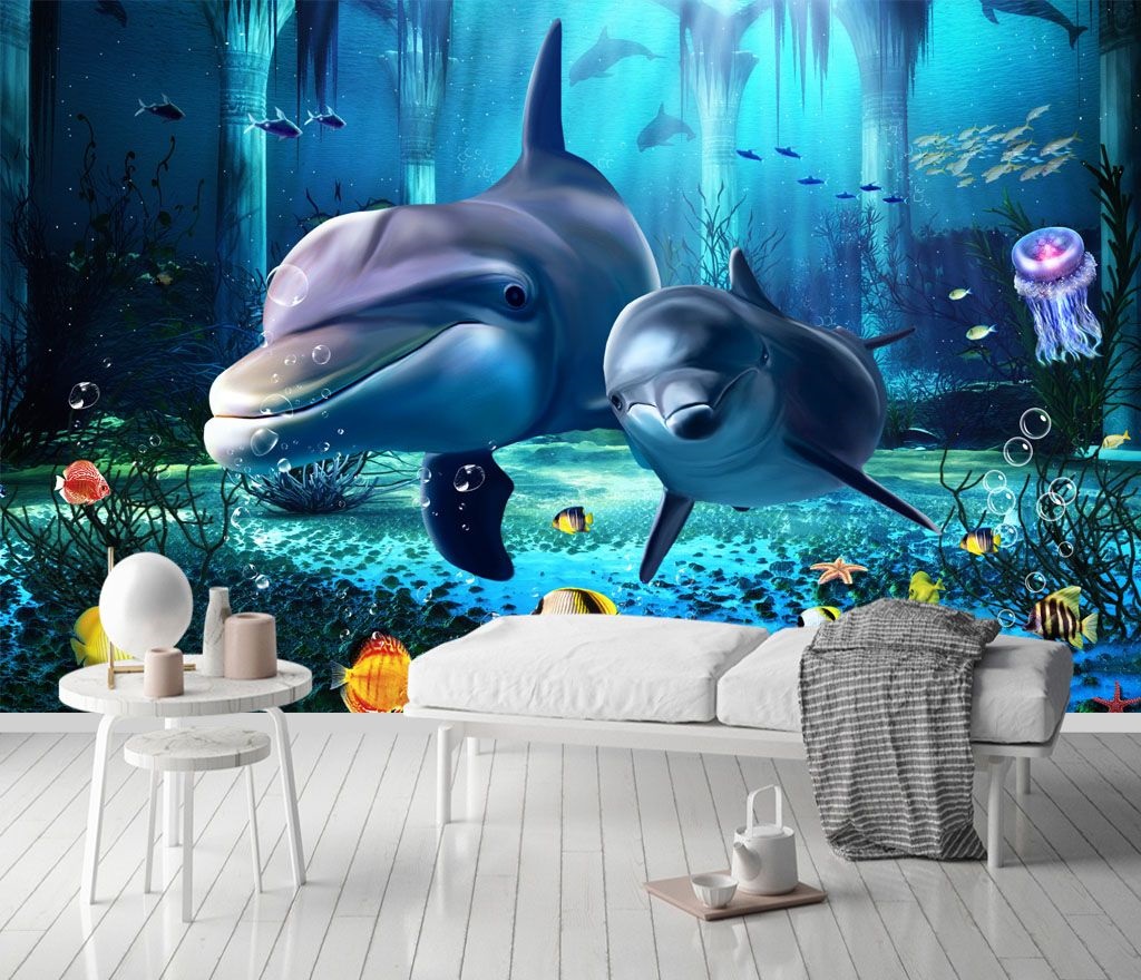 It’s not just decor; it’s an invitation to daydream about sunlit waves and sandy shores. Whether it’s a cozy reading nook or a lively living room, this mural adds a sense of calm and wonder. Who wouldn’t smile seeing those joyful dolphins glide gracefully? Perfect for ocean lovers or anyone wanting a taste of adventure without the salty hair!
