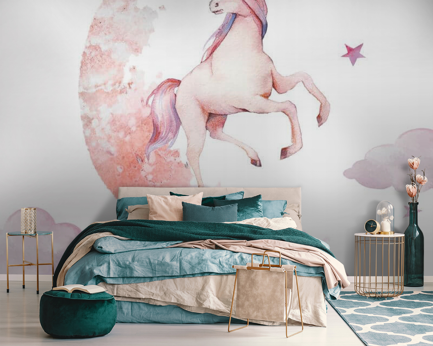 Odmień każdą przestrzeń dzięki tej kapryśnej fototapecie przedstawiającej jednorożca elegancko skaczącego nad księżycem. Idealna do pokoju dziecięcego lub dla każdego, kto ma słabość do magii, doda odrobinę cudowności do ścian. Wyobraź sobie przytulne wieczory spędzone na czytaniu bajek na dobranoc, a łagodna obecność jednorożca inspiruje sny o zaczarowanych krainach i miękkich chmurach. Figlarne róże i senne nocne wibracje z pewnością wywołają radość. Kto nie chciałby odrobiny magii w swoim domu? To tak, jakby mieć kawałek bajki tuż obok, tylko czekający, by zainspirować przygodę!