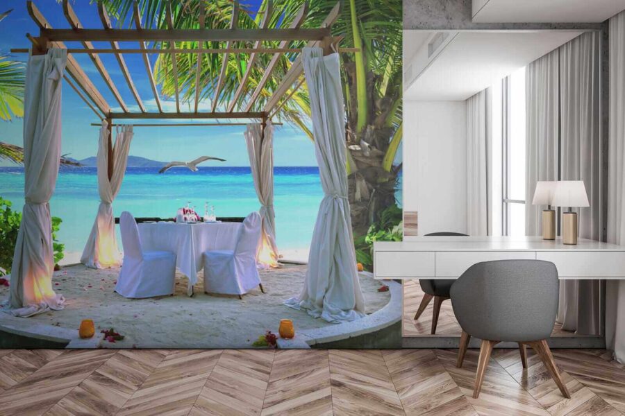 Wyobraź sobie, że wkraczasz do raju bez wychodzenia z domu. Ta żywa fototapeta „Wall Murals Table Set Up on a Beach” zaprasza Cię do relaksu w salonie, marząc o piasku pod stopami i morskiej bryzie. Wyobraź sobie romantyczną kolację pod kołyszącymi się palmami, z delikatnym szumem fal w tle. Za każdym razem, gdy na nią spojrzysz, poczujesz się jak na mini wakacjach! Dzięki żywym kolorom i tropikalnemu klimatowi ta fototapeta ożywi każdą przestrzeń. Idealna dla marzycieli i miłośników plaży, stanowi idealną równowagę między relaksem a przygodą. Wprowadź odrobinę magii plaży do swojego domu – kto by tego nie chciał?