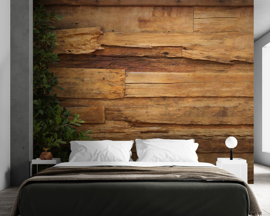Wyobraź sobie, że wnosisz urok rustykalnej, zwietrzałej drewnianej ściany prosto do swojego domu – z niespodzianką. Ta fototapeta “Zwietrzała drewniana ściana z zielenią” jest jak otulenie się przytulnym klimatem domku letniskowego w swoim salonie! Drewno wygląda na stare w najlepszy sposób, pełne charakteru i historii, a te zielone liście? Sprawiają, że czujesz się jak żywy, jakbyś miał naturę zaglądającą do twojej przestrzeni.