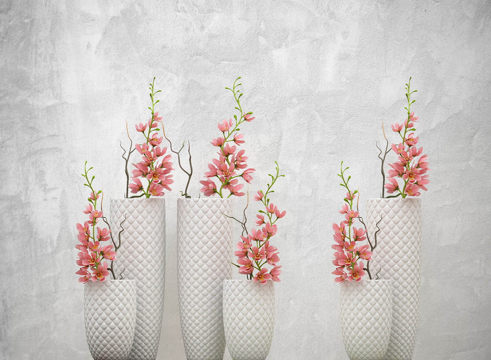 Zmień swoje wnętrze dzięki tej uroczej fototapecie przedstawiającej grupę białych wazonów ozdobionych różowymi kwiatami. To tak, jakbyś miał mini ogród japoński w swoim salonie – bez konieczności podlewania roślin! Wyobraź sobie, że po długim dniu wracasz do domu, siadasz na kanapie i witają Cię te piękne kwiaty. Delikatne kolory i subtelne detale wprowadzają poczucie spokoju, niczym łagodna bryza w wiosenny dzień. Idealne do stworzenia przytulnego kącika lub rozjaśnienia nudnego zakątka. Kto by pomyślał, że dekoracje mogą być tak urocze?