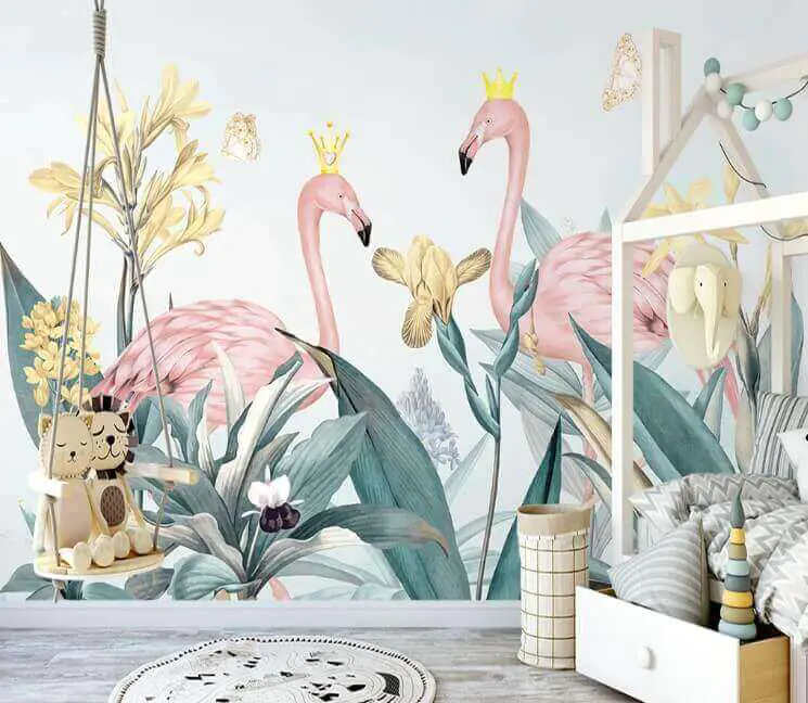 Transform any space with this whimsical wall mural featuring a pair of flamingos, complete with crowns—because why shouldn’t these fabulous birds get a royal treatment? Surrounded by vibrant flowers and leafy greens, it brings a splash of tropical fun indoors. Just imagine lounging with friends, sharing laughs, and letting the playful vibe elevate the room. Perfect for a living room or a creative corner, it’ll make anyone smile. A gentle reminder that life can be beautifully quirky. So, let those flamingos reign supreme in your home!