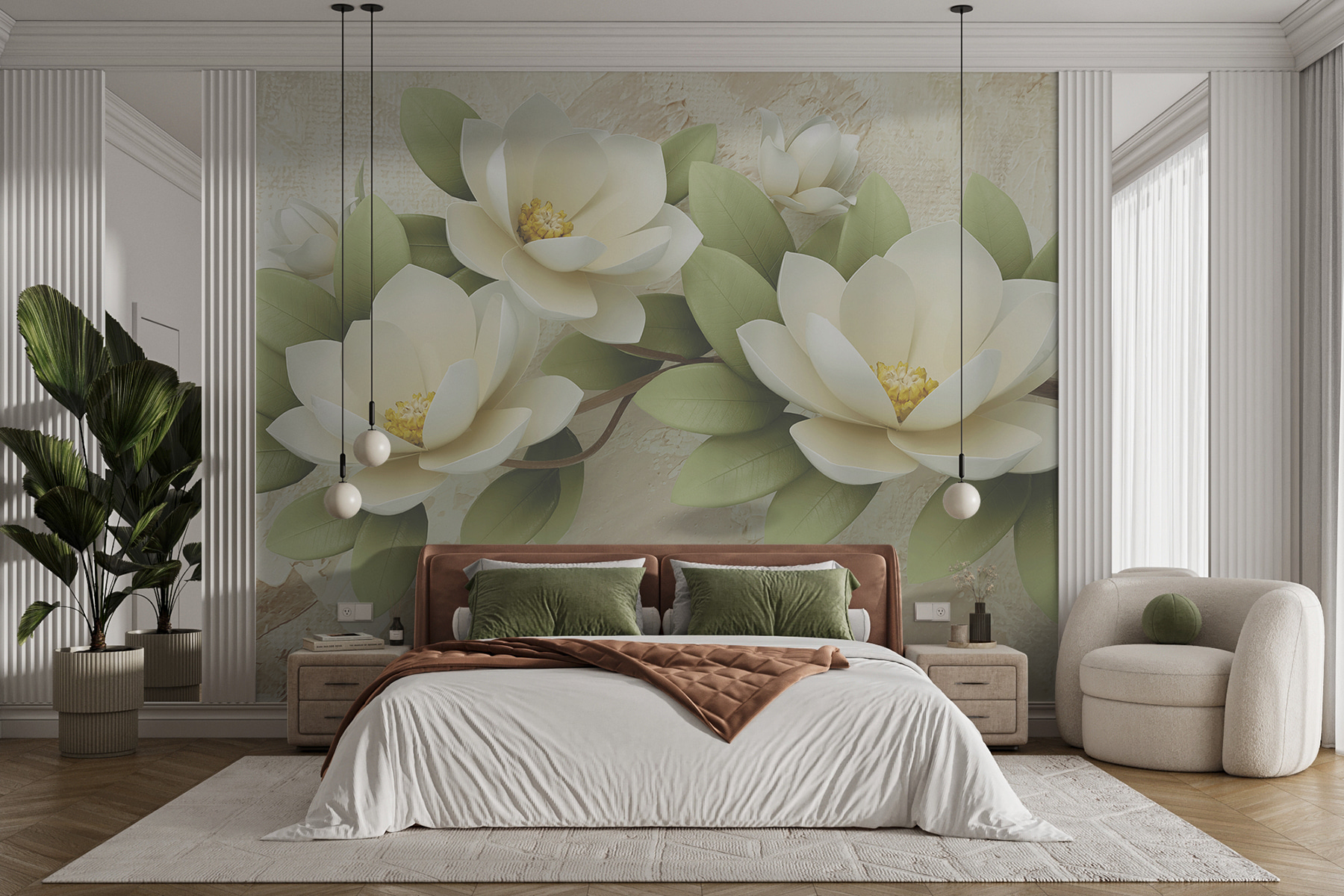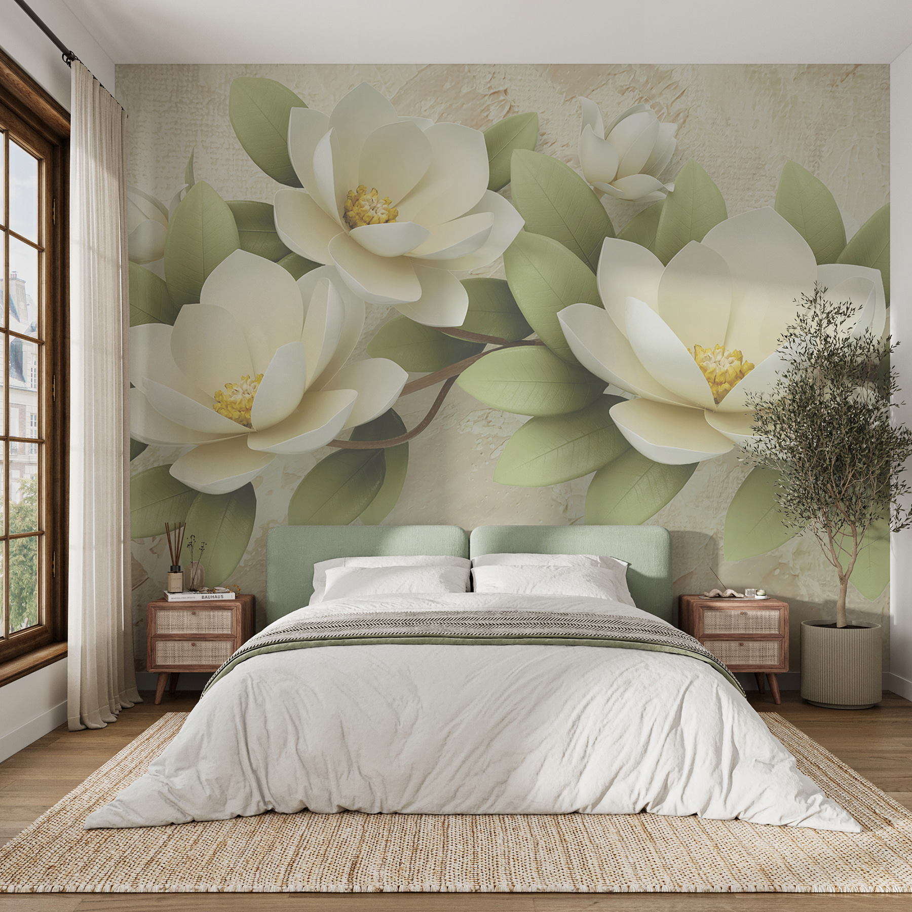 Wow, spójrz tylko na te kwiaty! Fototapeta ścienna “Eleganckie kwiaty z zielonymi liśćmi” jest jak kawałek spokoju w twoim pokoju. Wyobraź sobie, że każdego ranka budzisz się przy tych dużych, kremowych kwiatach – natychmiastowe orzeźwienie, prawda? To jak przeniesienie uroku wiosennego ogrodu do wnętrza bez konieczności jego pielęgnacji. Idealny dla tych, którzy kochają dotyk natury, ale nie mają zielonego kciuka.