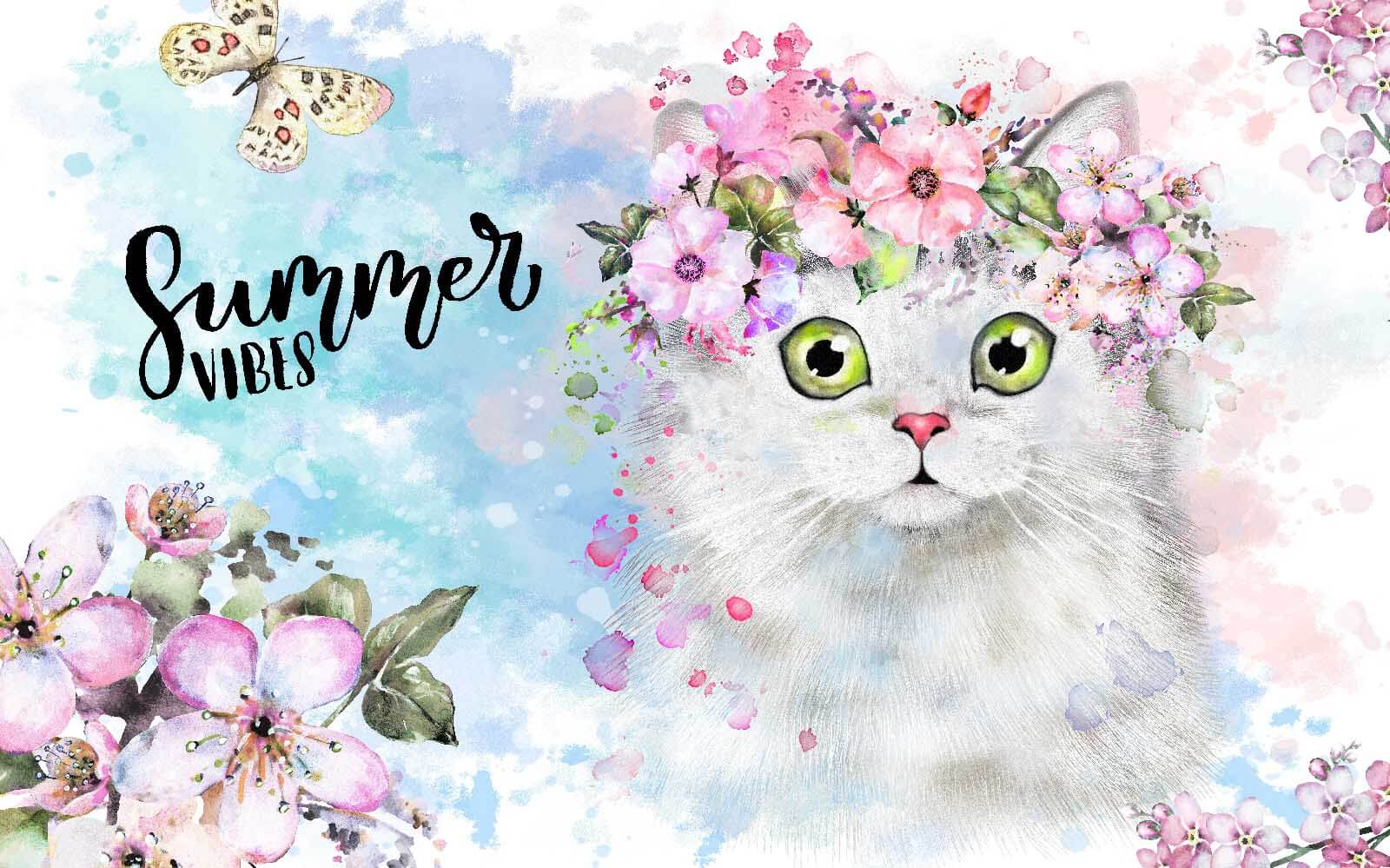 Odmień każde pomieszczenie dzięki tej zachwycającej fototapecie przedstawiającej uroczego kota ozdobionego bukietem kwiatów. Wyobraź sobie, że wchodzisz do pomieszczenia, w którym wita cię ta ujmująca twarz – to jak futrzany przyjaciel, który cię dopinguje! Miękkie akwarele tworzą poczucie spokoju, idealne do przytulnego kącika lub tętniącego życiem pokoju zabaw.