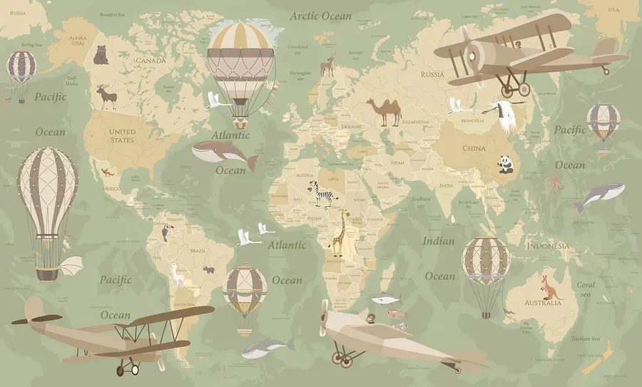 Dzieci pokochają śledzenie wyimaginowanych lotów i dostrzeganie uroczych zwierząt rozsianych po kontynentach. To jak ich własny program National Geographic, bez telewizora! I hej, to nie tylko dla najmłodszych. Ta fototapeta dodaje odrobinę cudowności każdemu, kto kocha odrobinę wędrówki lub uroku vintage.