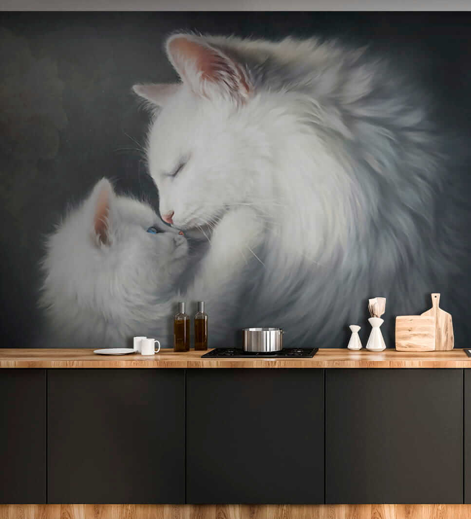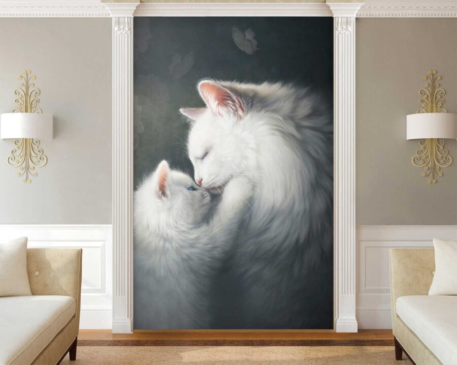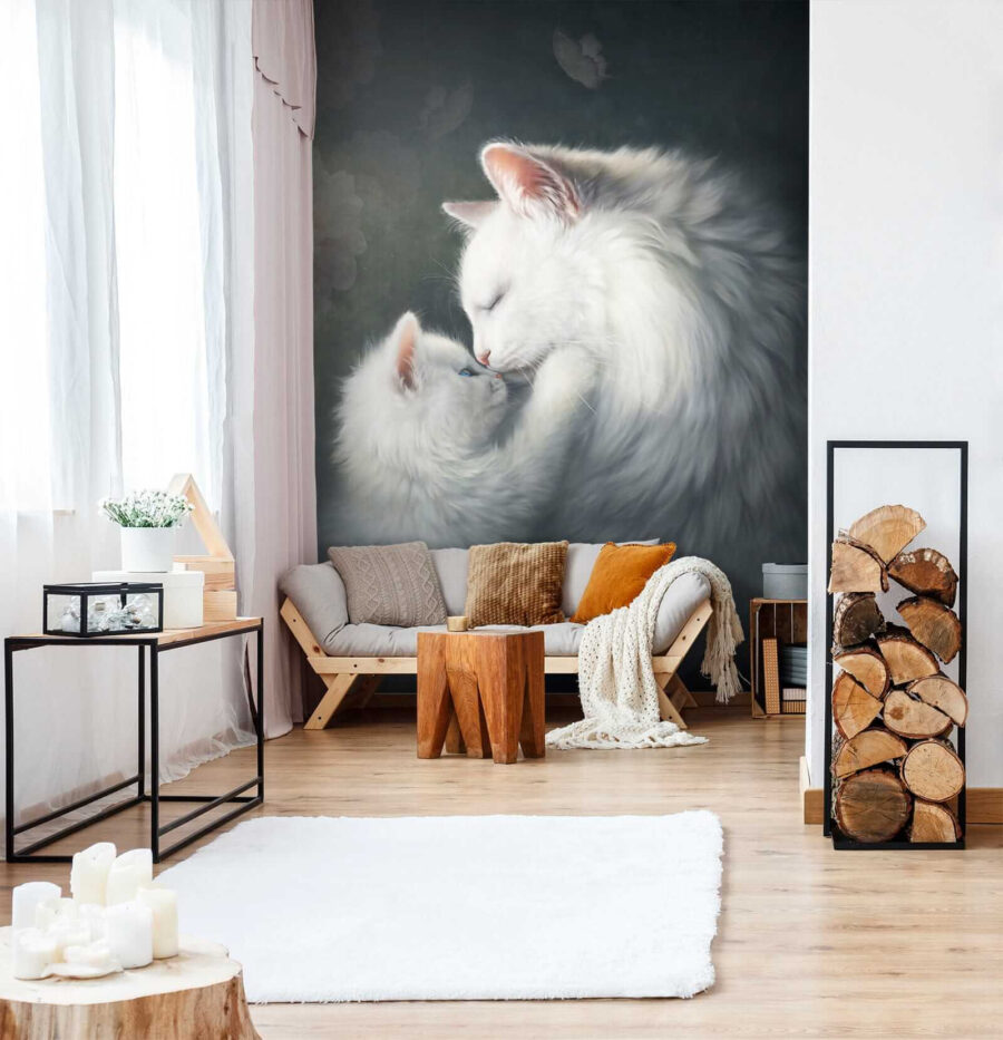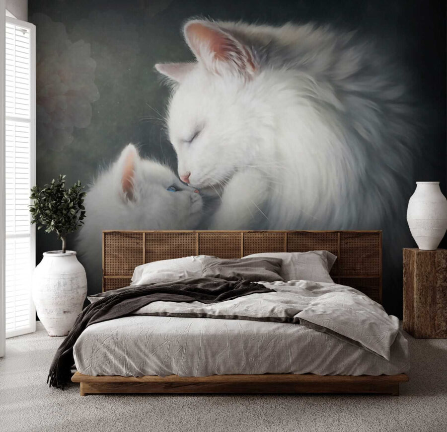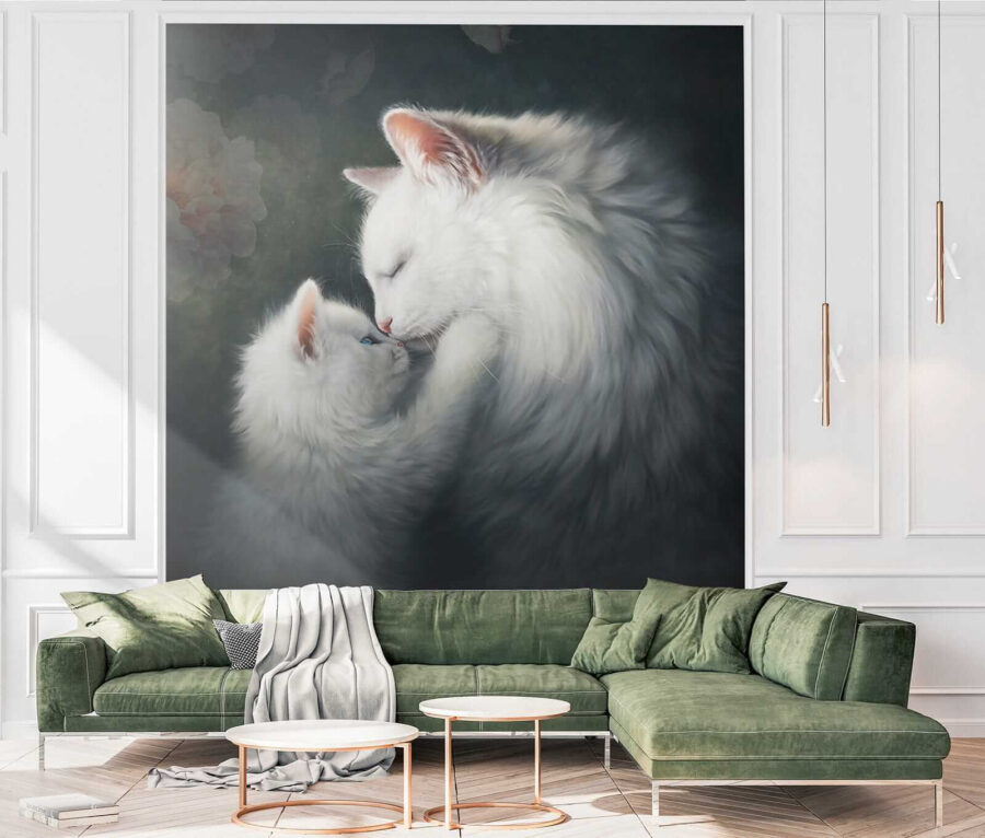 Spójrz tylko na te dwa puszyste zwierzaki! Ta fototapeta ścienna “Feline Affection at its Finest” całkowicie roztopi serca. Idealna do każdego pomieszczenia, które potrzebuje odrobiny ciepła i kaprysu – niezależnie od tego, czy jest to pokój dziecięcy, przytulny kącik do czytania, czy nawet salon. Wyobraź sobie, że każdego dnia budzisz się z tym uroczym duetem mamy i kociaka… natychmiastowa poprawa nastroju! I hej, kto może oprzeć się tym miękkim futerkom i czułym przytulankom, prawda?