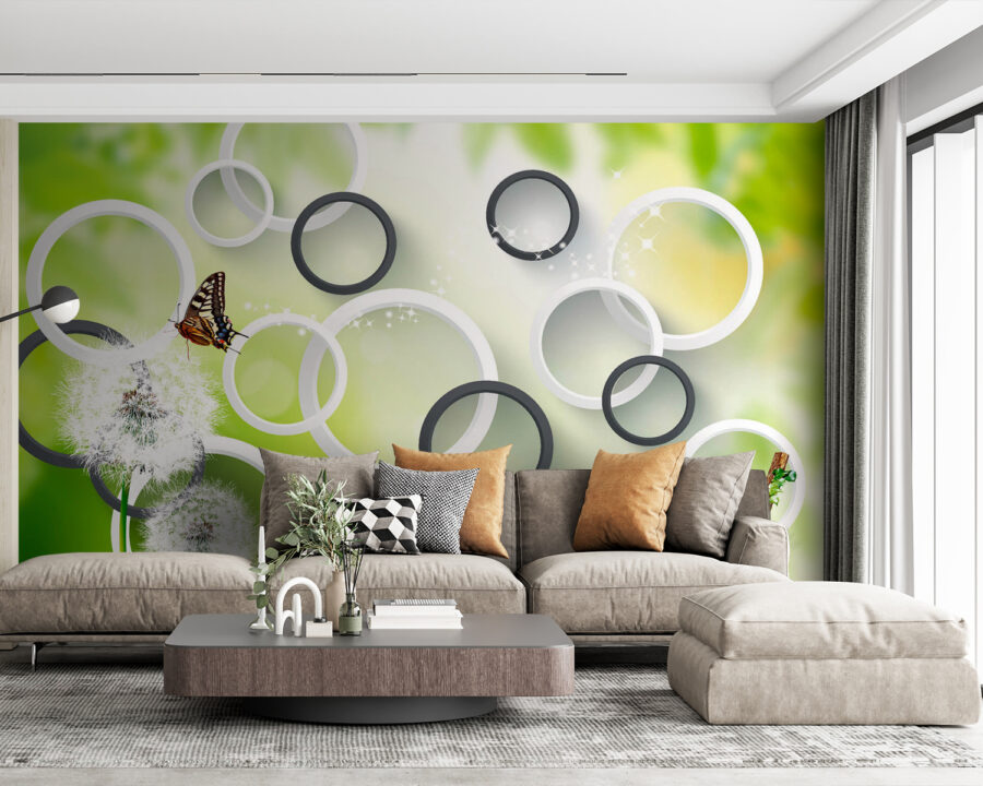 Zmień wygląd każdego pomieszczenia dzięki tej wspaniałej fototapecie „Motyl na kwiatku mniszka lekarskiego”. Wyobraź sobie delikatne kwiatki mniszka lekarskiego kołyszące się na wietrze, a obok nich delikatnego motyla – czysta magia, prawda? Żywe zielone kolory i figlarne kółka nadają pomieszczeniu świeżości i nowoczesności, sprawiając, że staje się ono żywe, a jednocześnie kojące. To jak wprowadzenie kawałka natury do wnętrza bez kichania! Idealna do przytulnego kącika do czytania lub fantazyjnego pokoju zabaw, ta fototapeta zachęca do marzeń i inspiruje kreatywność. Kto nie chciałby codziennej dawki piękna, zwłaszcza gdy może to pobudzić wyobraźnię? Niech ta fototapeta stanie się tłem dla Twoich małych przygód!
