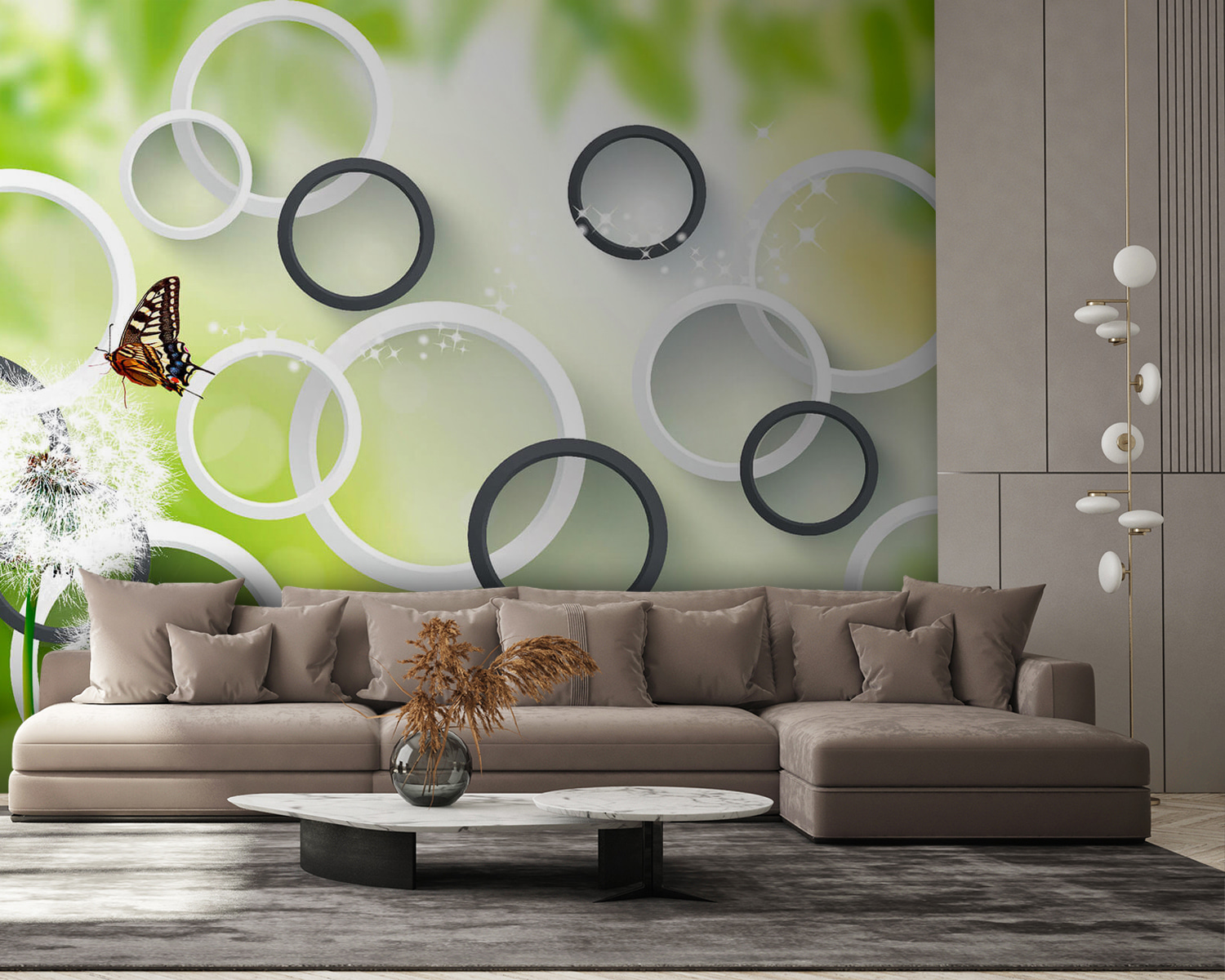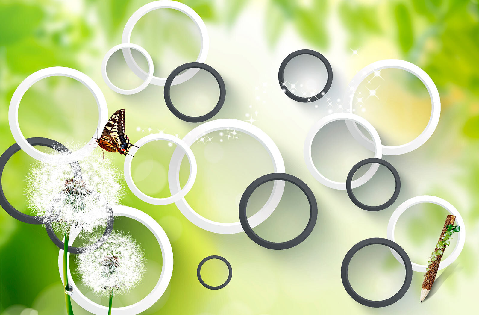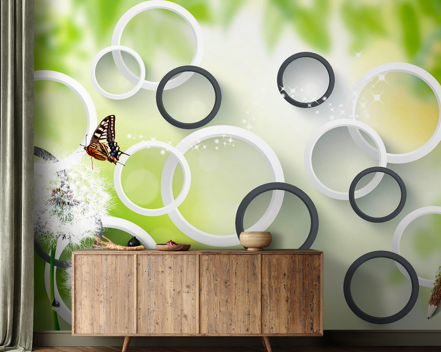 Zmień wygląd każdego pomieszczenia dzięki tej wspaniałej fototapecie „Motyl na kwiatku mniszka lekarskiego”. Wyobraź sobie delikatne kwiatki mniszka lekarskiego kołyszące się na wietrze, a obok nich delikatnego motyla – czysta magia, prawda? Żywe zielone kolory i figlarne kółka nadają pomieszczeniu świeżości i nowoczesności, sprawiając, że staje się ono żywe, a jednocześnie kojące. To jak wprowadzenie kawałka natury do wnętrza bez kichania! Idealna do przytulnego kącika do czytania lub fantazyjnego pokoju zabaw, ta fototapeta zachęca do marzeń i inspiruje kreatywność. Kto nie chciałby codziennej dawki piękna, zwłaszcza gdy może to pobudzić wyobraźnię? Niech ta fototapeta stanie się tłem dla Twoich małych przygód!