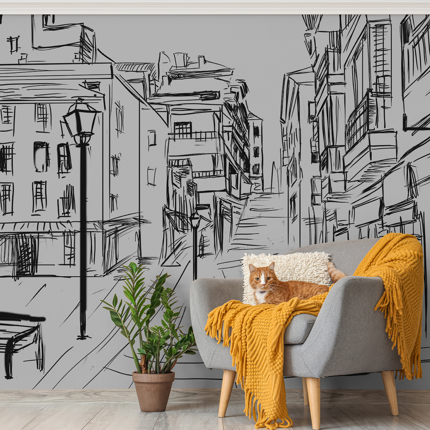 Wyobraź sobie wylegiwanie się w salonie z tą oszałamiającą czarno-białą fototapetą na ścianie. To jak kapryśny szkic, który ożywa! Zabawne linie przedstawiające miejską scenę – wraz z samotną ławką i wysokimi budynkami – wnoszą artystyczny styl, który sprawi, że będziesz marzyć o europejskich ulicach.