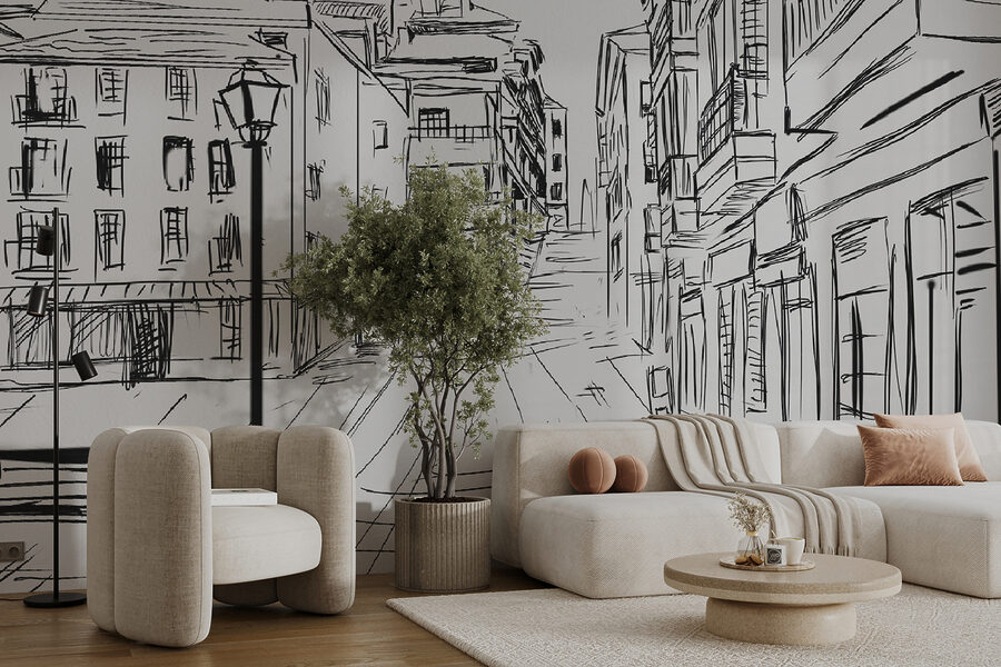 Wyobraź sobie wylegiwanie się w salonie z tą oszałamiającą czarno-białą fototapetą na ścianie. To jak kapryśny szkic, który ożywa! Zabawne linie przedstawiające miejską scenę – wraz z samotną ławką i wysokimi budynkami – wnoszą artystyczny styl, który sprawi, że będziesz marzyć o europejskich ulicach.