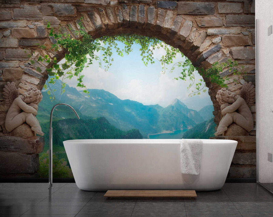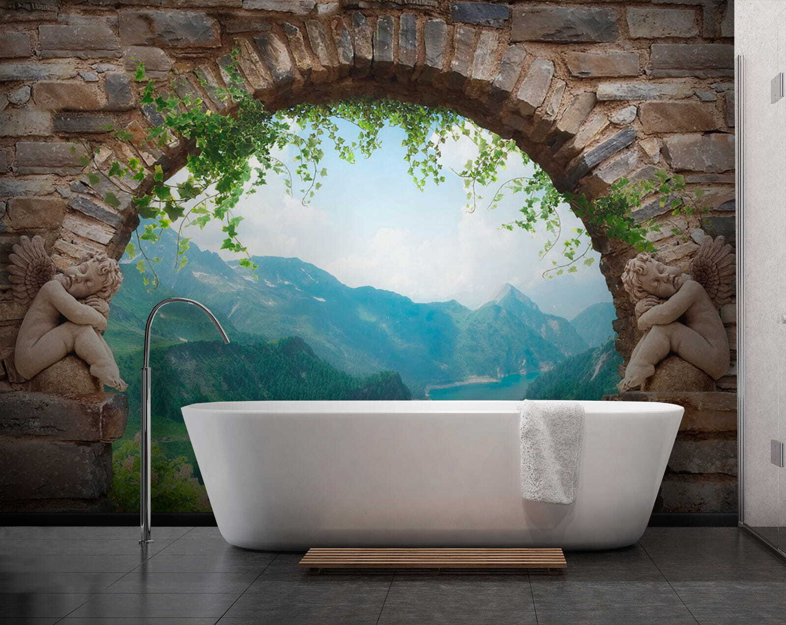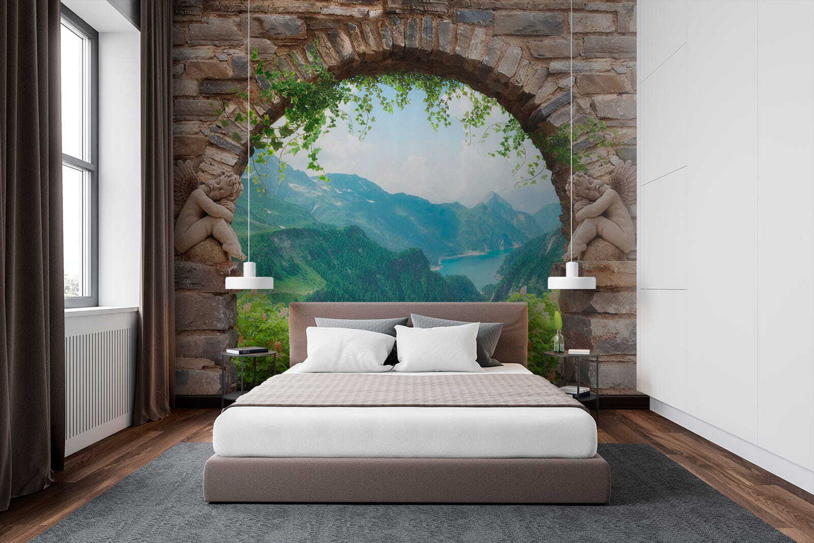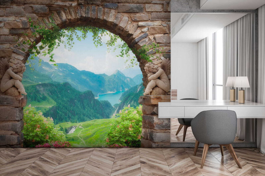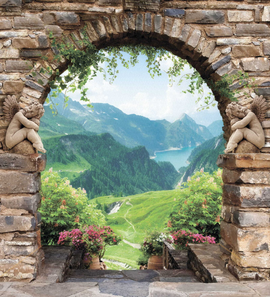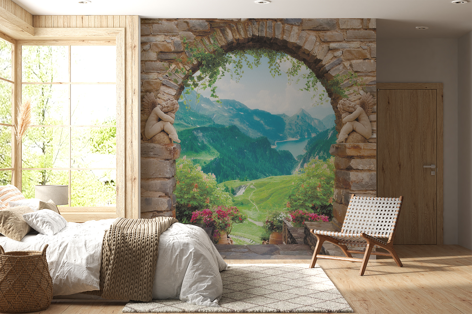 Wyobraź sobie, że przechodzisz przez rustykalny kamienny łuk, który prowadzi prosto do zapierającego dech w piersiach widoku na dolinę. Ta fototapeta to nie tylko dekoracja; każdego dnia pobudza do przeżycia małej przygody. Wyobraź sobie popijanie porannej kawy, patrząc na bujną zieleń i połyskującą wodę poniżej. Zabawne cherubiny po obu stronach dodają odrobinę kaprysu, dzięki czemu można poczuć się jak w bajce. Idealna do salonu lub przytulnego kącika, ta fototapeta przekształca każdą przestrzeń w senną ucieczkę. To tak, jakby mieć kawałek natury bezpośrednio na ścianie, bez wysiłku zapraszając poczucie spokoju i zachwytu do codziennego życia. Tylko nie zapomnij podlać tych wyimaginowanych roślin!