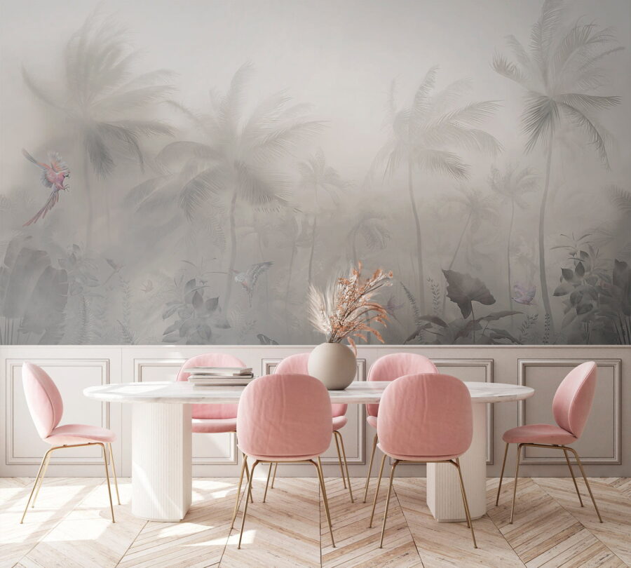 Zmień dowolną przestrzeń w wymarzoną przystań dzięki tej czarującej fototapecie – „Mglisty las z palmami i motylami”. Za każdym razem, gdy przechodzisz obok, czujesz się jakbyś wkraczał do spokojnej tropikalnej przystani. Te delikatne stworzenia dodają odrobinę fantazji, sprawiając, że czujesz się trochę jak w bajce. Delikatne, mgliste odcienie tworzą spokojny nastrój, idealny do marzeń lub przytulnych rozmów przy kawie. Wyobraź sobie tę fototapetę za miękkim fotelem, która zamieni Twój kącik do czytania w osobistą oazę. Kto nie poczułby się tu zrelaksowany? Ta fototapeta to Twój bilet do swobodnej, wyspiarskiej atmosfery bez konieczności stosowania kremu z filtrem przeciwsłonecznym!