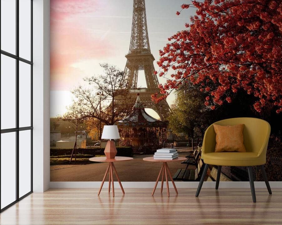 Zmień każdą ścianę w spokojną przystań dzięki tej fototapecie „Park z ławkami i wieżą”. Wyobraź sobie: wchodzisz do swojego pokoju i przed oczami pojawia się zachęcająca scena z parku – popołudniowy spacer pod kwitnącymi drzewami, z Wieżą Eiffla wyglądającą spomiędzy gałęzi jak stary przyjaciel. Delikatne kolory tworzą spokojną atmosferę, idealną do relaksu po długim dniu lub inspirowania kreatywności w leniwy poranek.