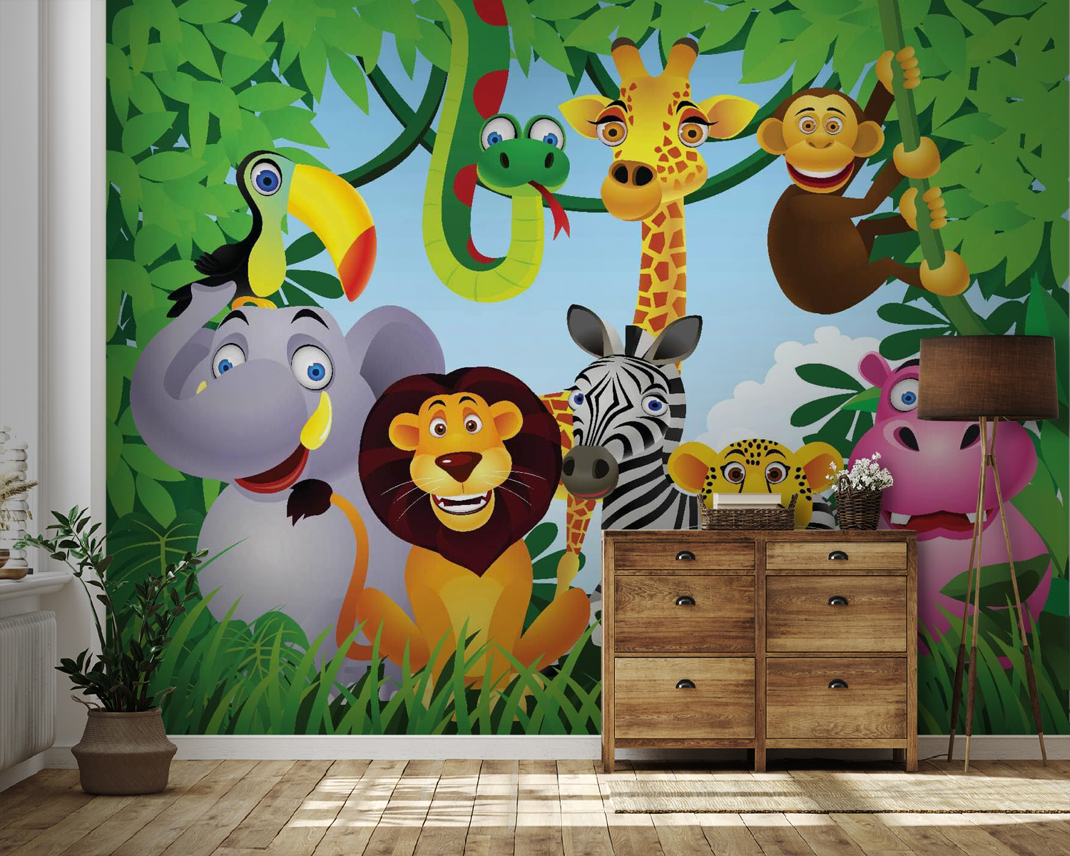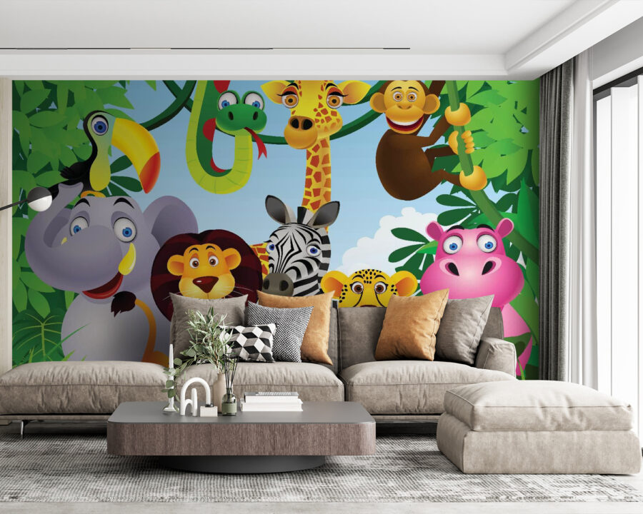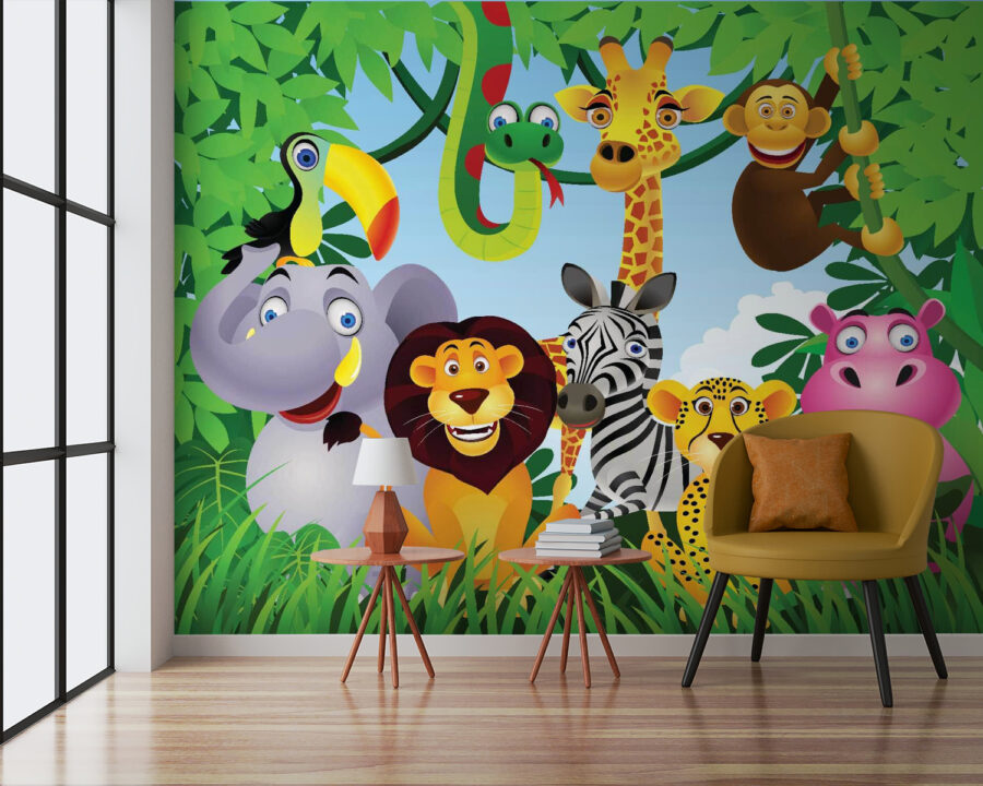 Zmień dowolną przestrzeń w pełną życia dżunglę dzięki tej wesołej fototapecie przedstawiającej żywiołową grupę zwierząt. Wyobraź sobie słonia z głupkowatym uśmiechem, tańczącą żyrafę i mądrego starego lwa – każde z tych zwierząt ma swoją osobowość! Ta fototapeta to nie tylko dekoracja, ale także brama do świata wyobraźni. Dzieciom spodoba się wyszukiwanie swoich ulubionych stworzeń, a dorośli mogą dostrzec w nich swoje wewnętrzne dziecko. Idealna do pokoju zabaw lub pokoju dziecięcego, wprowadza odrobinę zabawy i śmiechu na ściany. Kto nie chciałby, aby jego przestrzeń przypominała imprezę w dżungli? Praktycznie prosi się o czytanie bajek pod swoim zabawnym baldachimem! Niech rozpocznie się szalona zabawa!