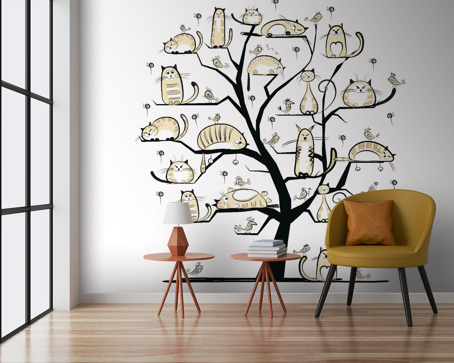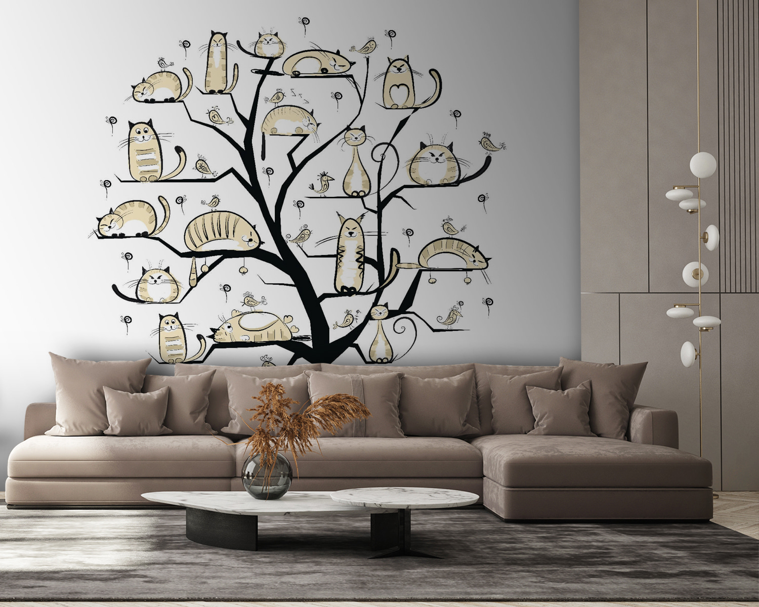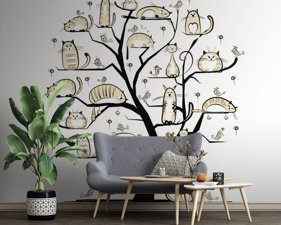Wyobraź sobie fantazyjne drzewo, którego gałęzie są wesoło ozdobione kotami o różnych kształtach i rozmiarach – niektóre drzemią, inne planują epickie przygody. Ta fototapeta to nie tylko dekoracja ścienna, ale także nietypowy temat do rozmowy. Wyobraź sobie ją w przytulnym kąciku, gdzie spotykają się przyjaciele, a powietrze wypełnia śmiech. Delikatne, neutralne odcienie tworzą spokojną atmosferę, idealną na leniwe niedziele, kiedy chcesz po prostu napić się kawy i cieszyć się urokiem swojego wnętrza. To tak, jakbyś miał kocią rodzinę na ścianie, zawsze gotową do zabawy — lub drzemki. Miłośnicy kotów? Będą zachwyceni.
