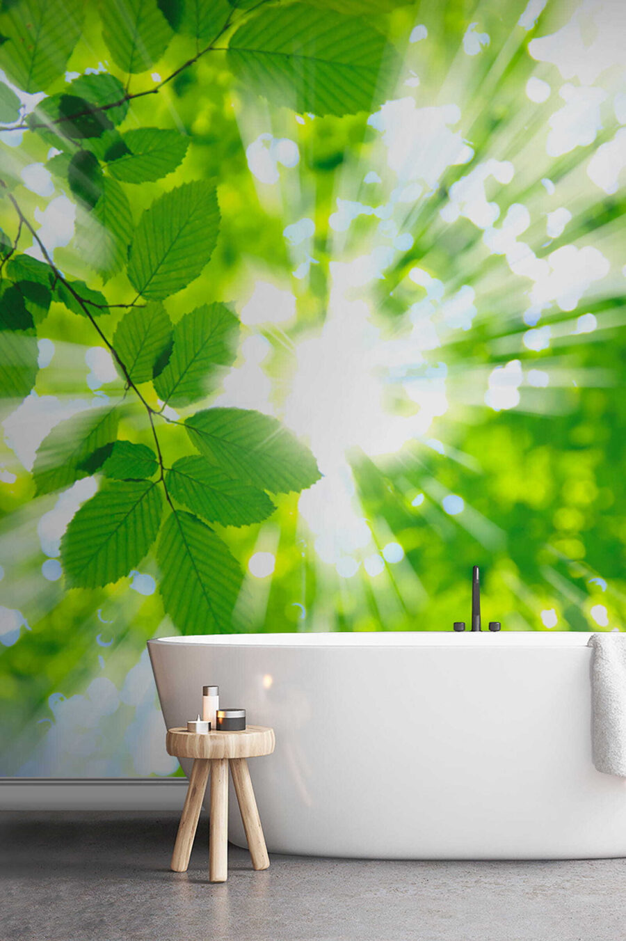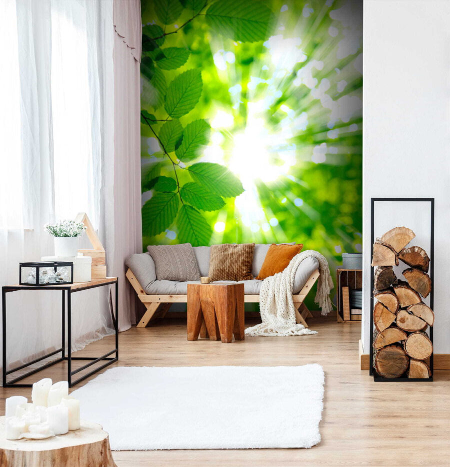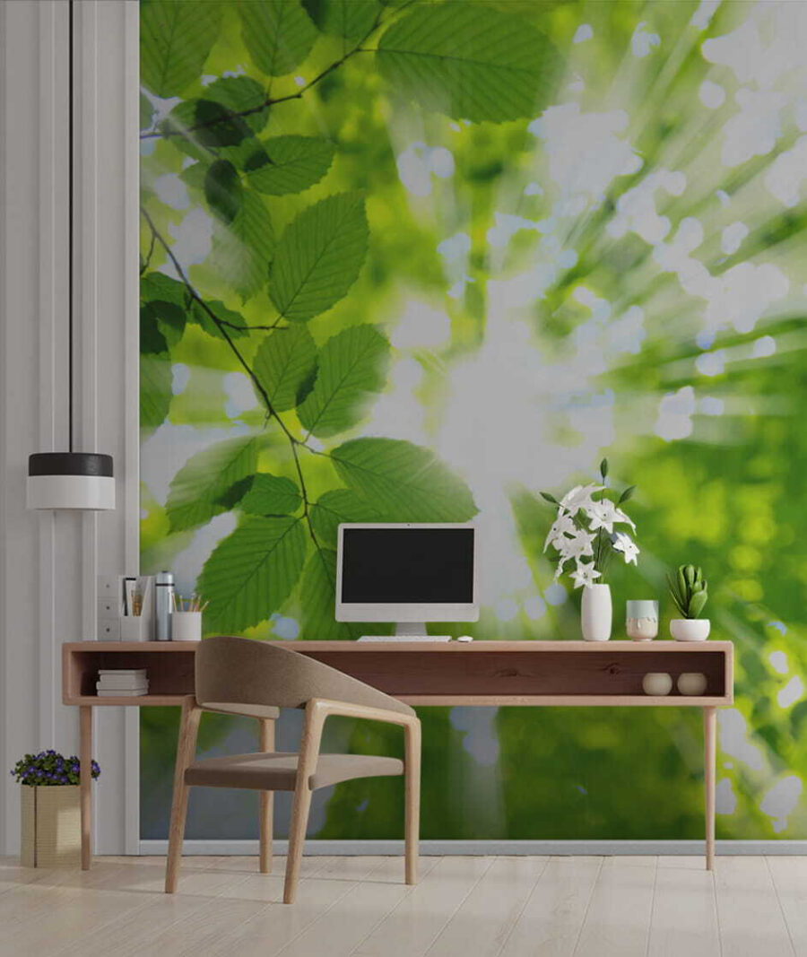 Sposób, w jaki światło przenika przez te liście – to czysta magia, prawie tak, jakby można było poczuć ciepło na twarzy. Jest bezkonkurencyjnie spokojny, jakby natura przytulała cię za każdym razem, gdy wchodzisz do pokoju. Idealna do sypialni, domowego biura lub kącika do czytania, który ciągle obiecujesz wykorzystać. Ta fototapeta to nie tylko dekoracja; to mały kawałek spokoju bezpośrednio na ścianie. Zgódźmy się wszyscy: kto nie potrzebuje tego więcej?