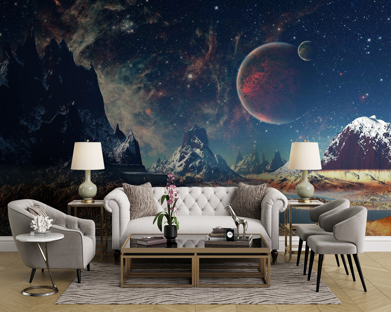 Odmień dowolną przestrzeń dzięki tej oszałamiającej górskiej fototapecie, na której ośnieżone szczyty spotykają się z rozgwieżdżonym kosmicznym tłem. Wyobraź sobie, że wchodzisz do pokoju, w którym czujesz się jak podczas przygody, gdzie każde spojrzenie na góry pobudza marzenia o odkrywaniu niezbadanych światów. Ta dekoracja przenosi poczucie ucieczki prosto na ściany, tak jakbyś patrzył na odległe galaktyki, popijając poranną kawę. To rodzaj dekoracji, która nie tylko upiększa, ale także inspiruje. Idealny do przytulnego kąta lub ściany, która po prostu potrzebuje trochę dodatkowej miłości. Spraw, aby Twój dom stał się portalem do niezwykłego miejsca.