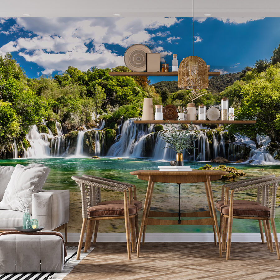 Przekształć dowolny pokój w spokojną ucieczkę dzięki tej oszałamiającej fototapecie przedstawiającej błękitne niebo usiane puszystymi chmurami i żywymi drzewami. Wyobraź sobie, że każdego dnia budzisz się z delikatnym przypomnieniem piękna natury – to jak przeniesienie się na zewnątrz, bez robaków. Idealny do przytulnego salonu lub spokojnego zakątka, zachęca do marzeń i słonecznych wibracji. Ponadto jest to świetny początek rozmowy. Wyobraź sobie znajomych spędzających czas, podziwiających twoją “oazę na świeżym powietrzu”, a jednocześnie zastanawiających się, jak udało ci się uzyskać tak fajny wygląd. To dotyk natury, który nigdy nie wychodzi z mody.
