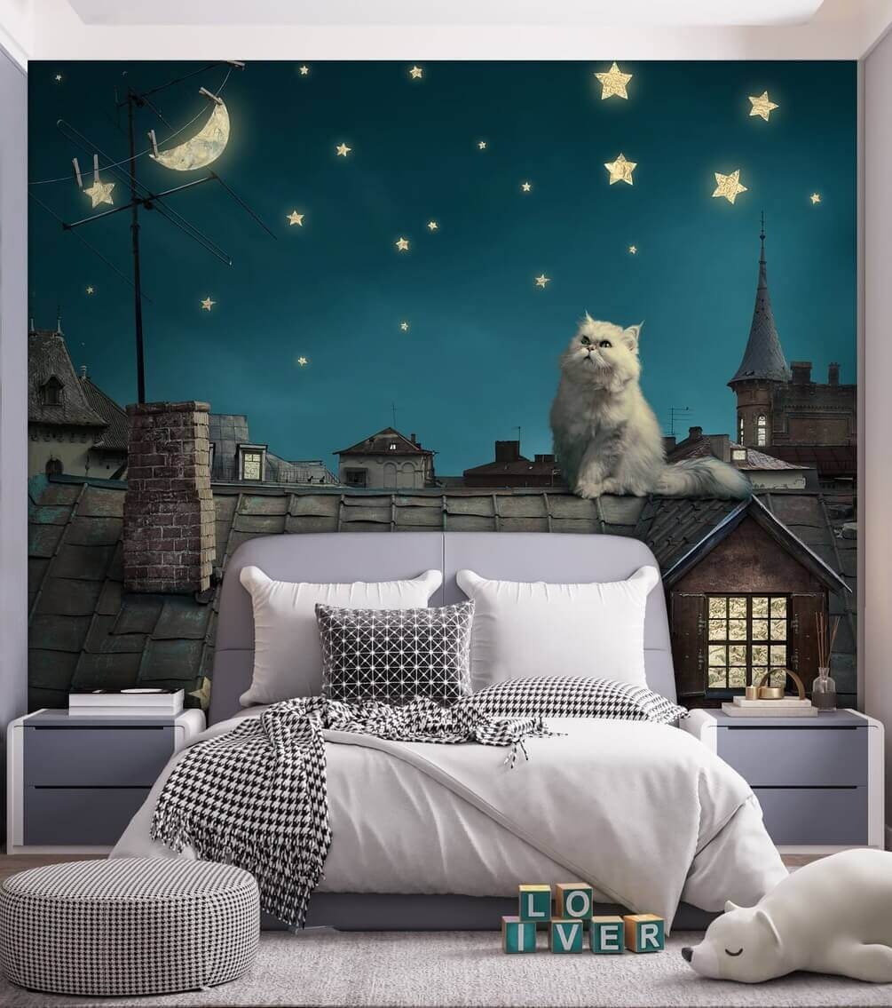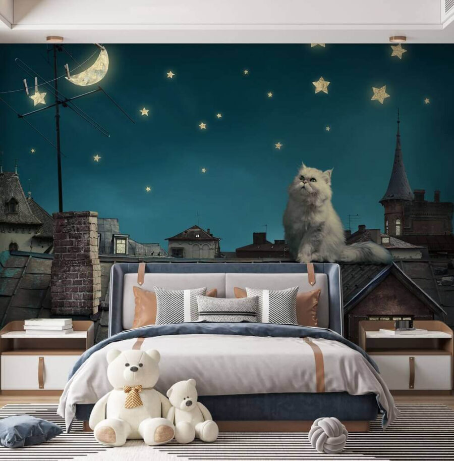 Oto mural, który sprawi, że będziesz marzyć o nocach na dachu i rozgwieżdżonym niebie. “Kot wpatruje się w nocne niebo” jest jak coś z kapryśnej bajki na dobranoc. Wyobraź sobie tę scenę w swoim salonie lub pokoju dziecka – jest taka magiczna! Rozmarzone spojrzenie kota na gwiazdy to czysty czar, spokojna ucieczka od zgiełku. Dzieci pokochają ten zabawny klimat; dorośli pokochają uspokajającą estetykę. To mieszanka abstrakcyjnego uroku i dziecięcego zachwytu, idealna do pobudzania wyobraźni. Poza tym, kto mógłby się oprzeć temu uroczemu, puszystemu kotu z zaciekawieniem wpatrującemu się w noc?