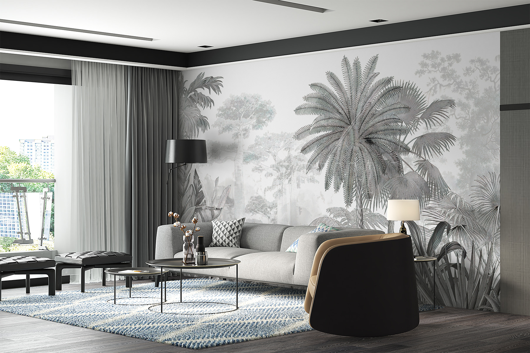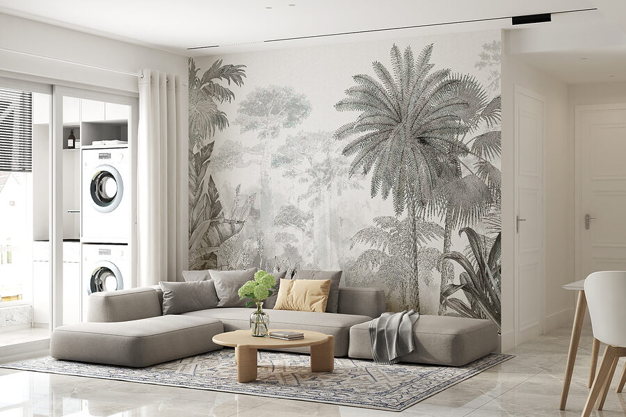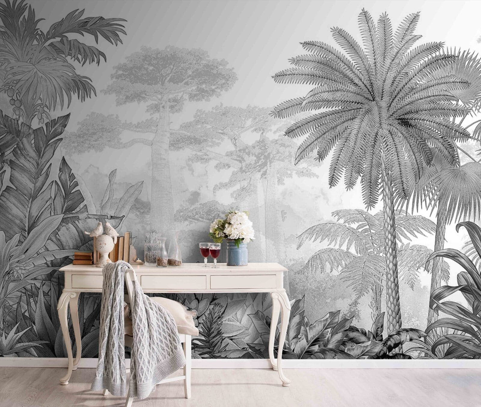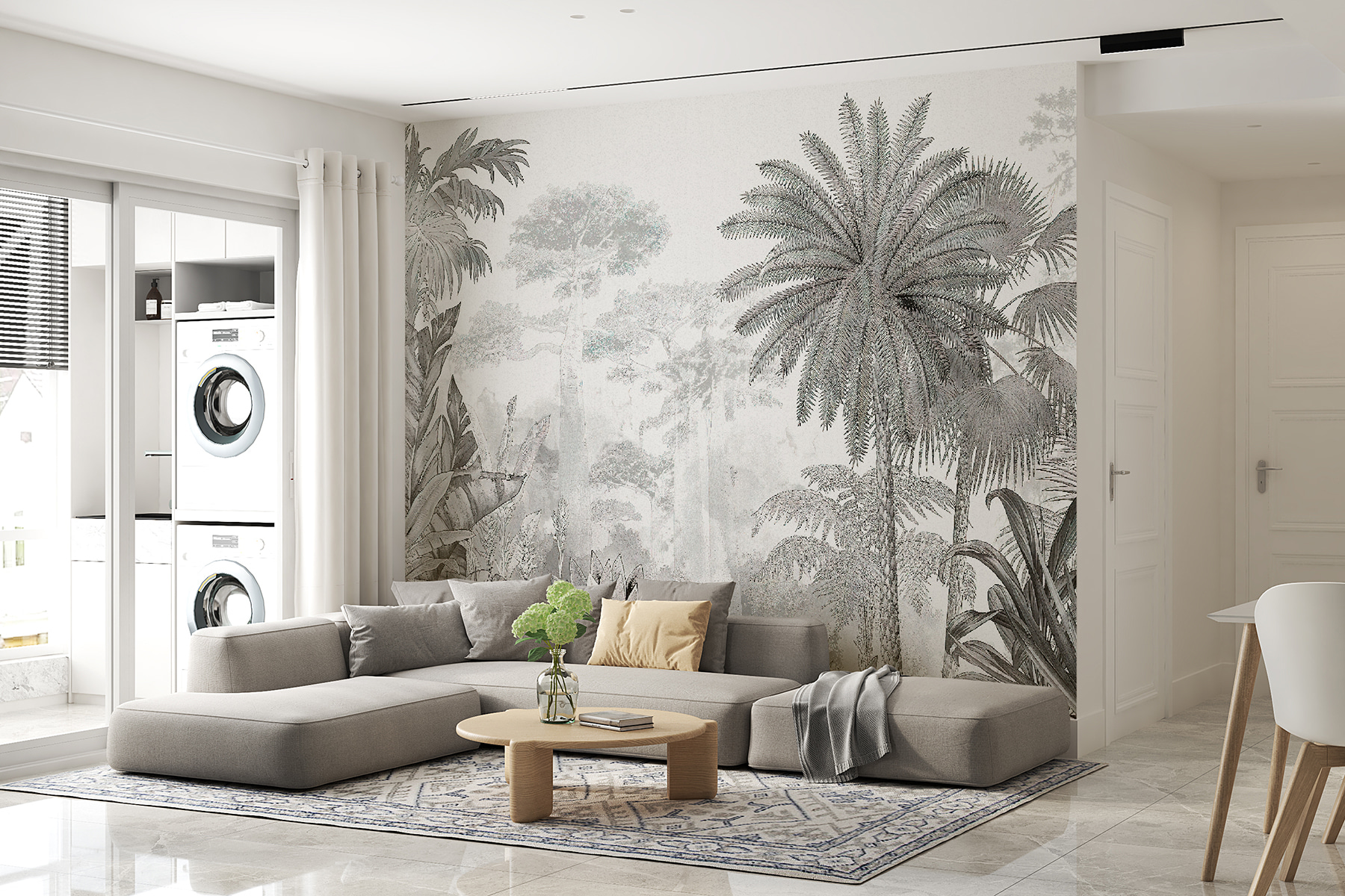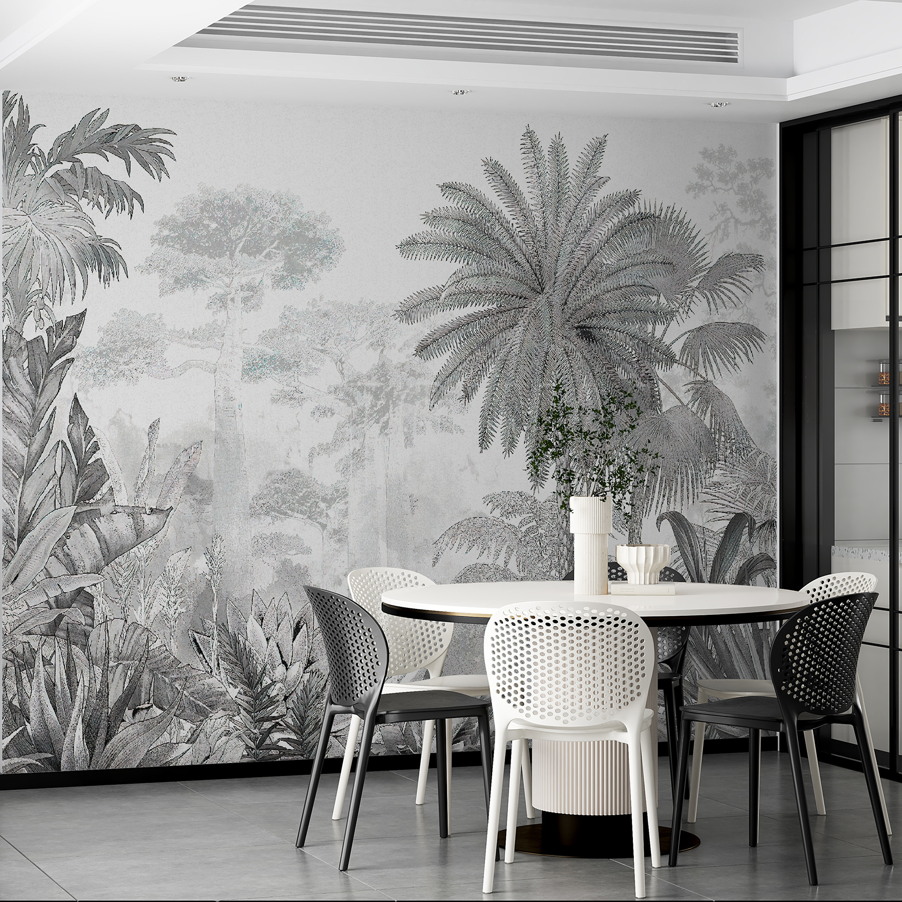 Ta fototapeta przedstawia hipnotyzującą mieszankę palm i liści dżungli, tworząc głębię i to wciągające uczucie, którego wszyscy potajemnie pragniemy. Wyobraź sobie, że wchodzisz do swojego salonu i czujesz się, jakbyś właśnie wyszedł ze zgiełku i przeniósł się do wymarzonego tropikalnego raju. Świetnie nadaje się na wyrazistą ścianę, a monochromatyczne odcienie sprawiają, że jest wyrafinowana, a nie przytłaczająca.