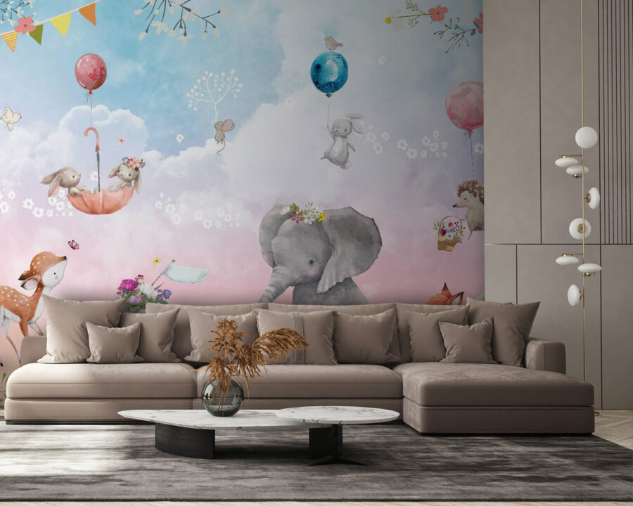 Zmień swoje wnętrze dzięki tej uroczej fototapecie przedstawiającej fantazyjne zwierzęta i wesołe balony. Wyobraź sobie łagodnego słonia, ozdobionego kwiatami, dzielącego chwilę z figlarnymi królikami i ciekawskim jeżem – wszyscy rozkoszują się sielankowym, pastelowym niebem. To jak scena z czarującej bajki!