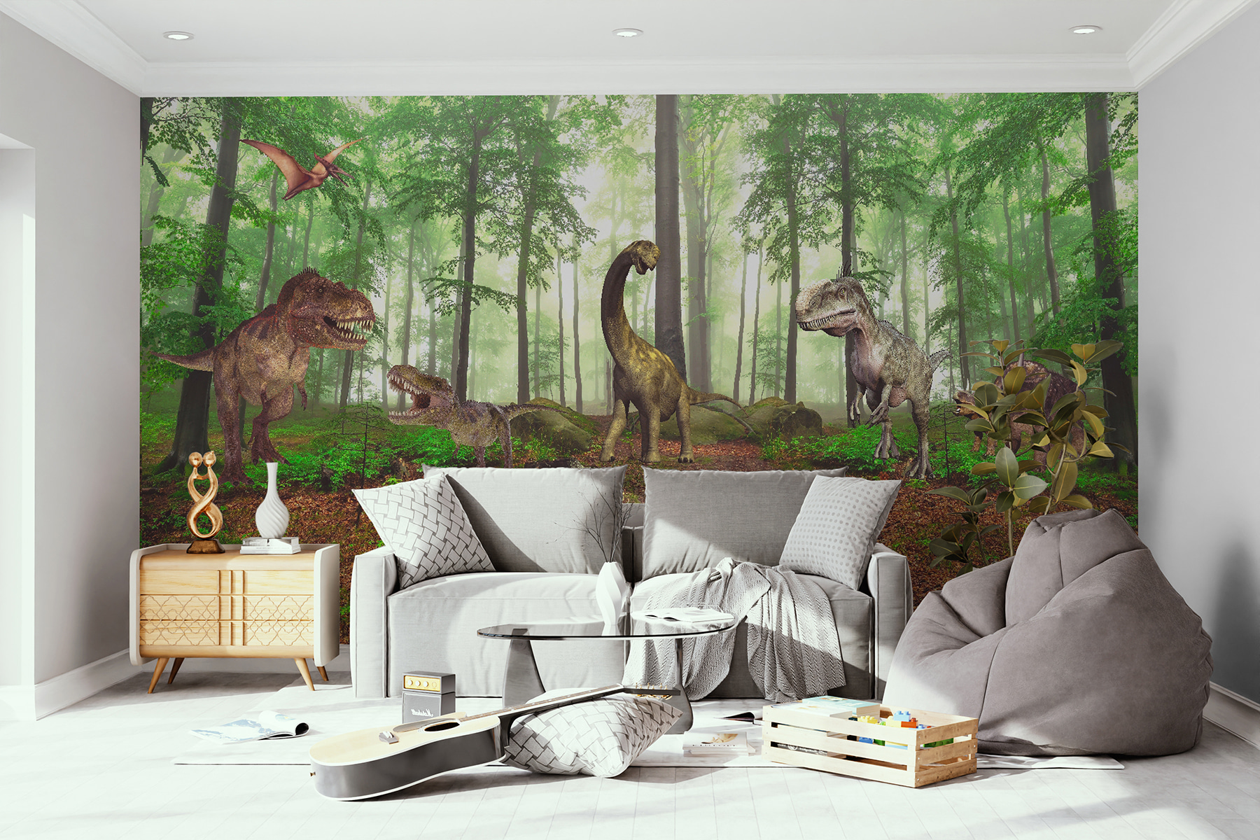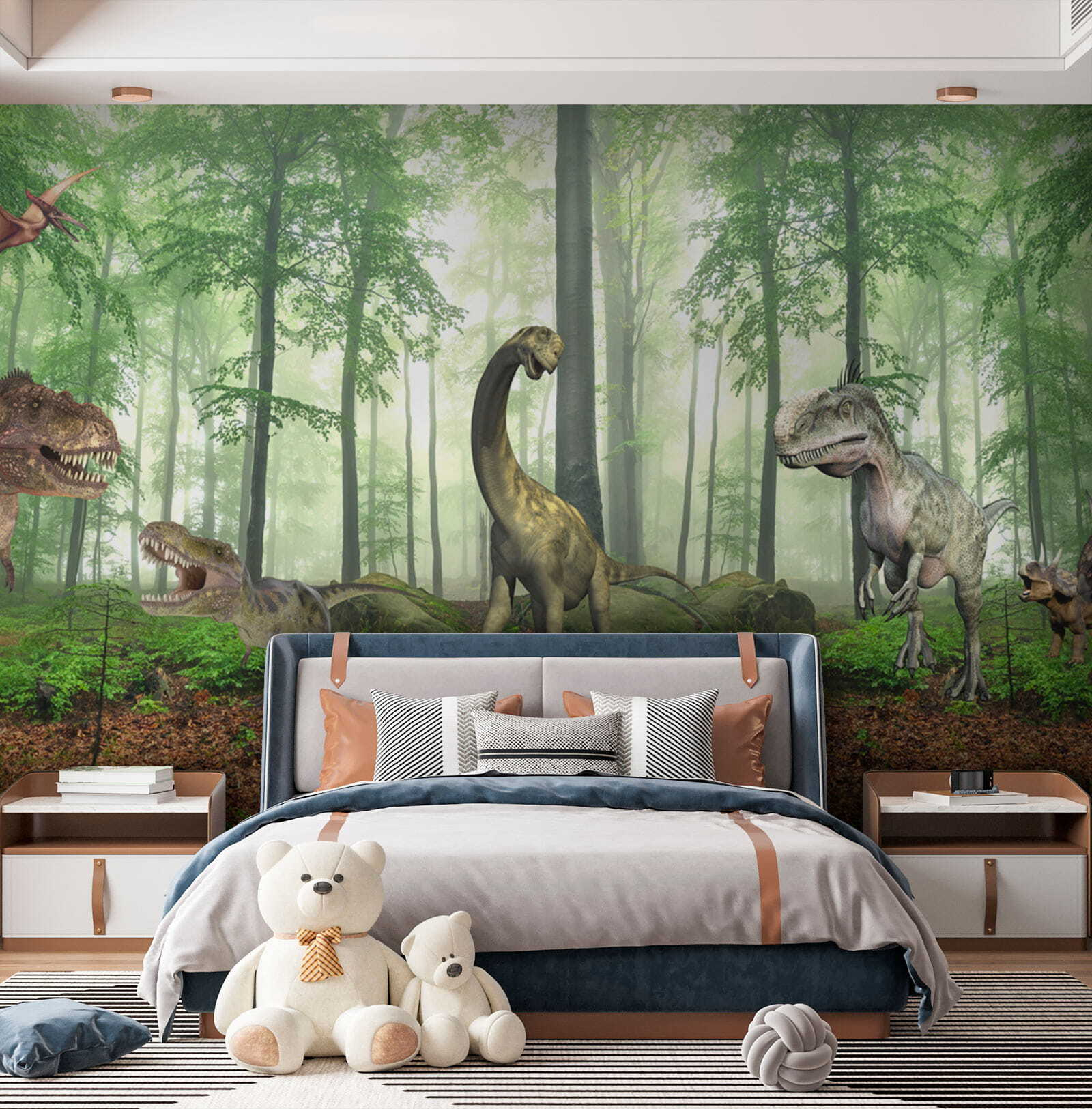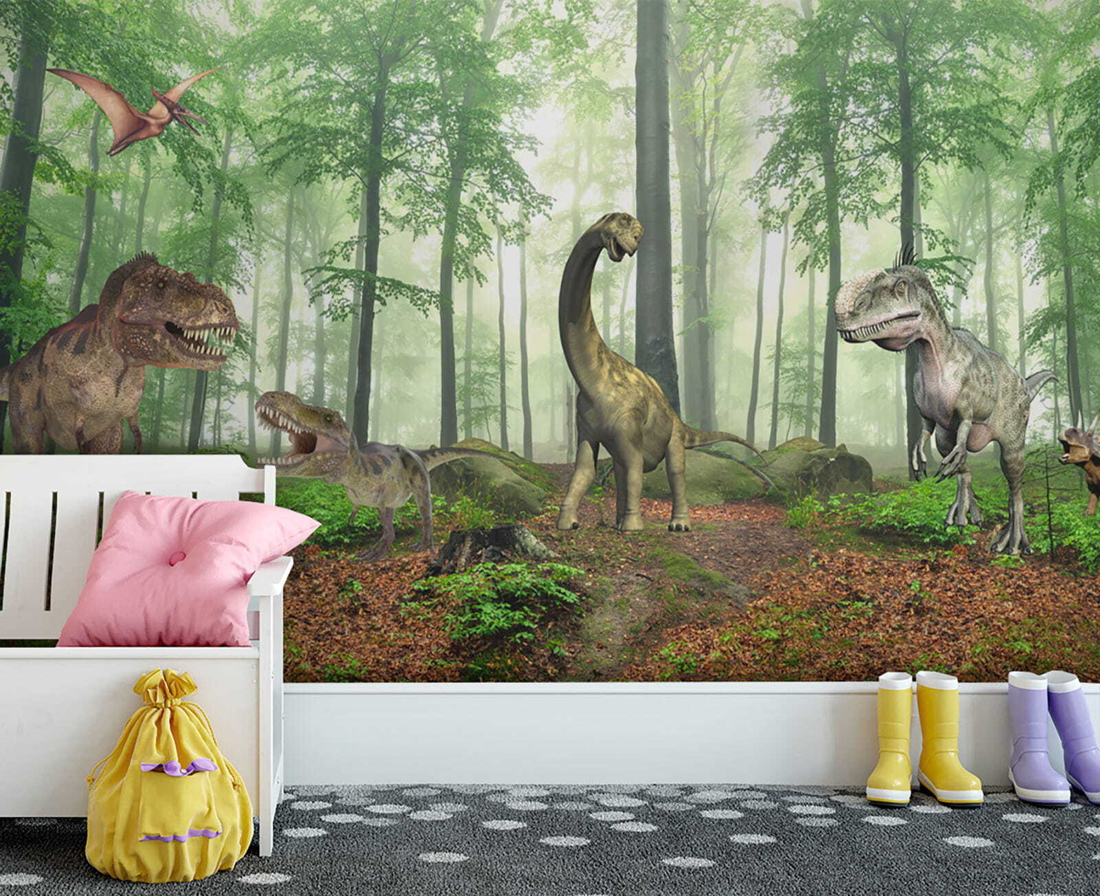 Wkrocz do prehistorycznego świata dzięki tej olśniewającej fototapecie ściennej “Dinozaur w lesie”. Wyobraź sobie, że zmieniasz dowolny pokój w tętniący życiem las jurajski – dzieci poczują się jak mali odkrywcy, wędrujący między strzelistymi drzewami i przyjaznymi dinozaurami. To idealne rozwiązanie, aby pobudzić ich wyobraźnię, a kto wie, może nawet uda ci się ominąć T-Rexa podczas zabawy! Bujna zieleń i szczegółowe dinozaury sprawiają, że wydaje się niemal realistyczny, wnosząc odrobinę przygody i zachwytu do codziennej harówki. Wspaniały akcent do każdego pokoju dziecięcego, a nawet zabawny zwrot dla odważnych entuzjastów wystroju. Gromkie brawa gwarantowane!