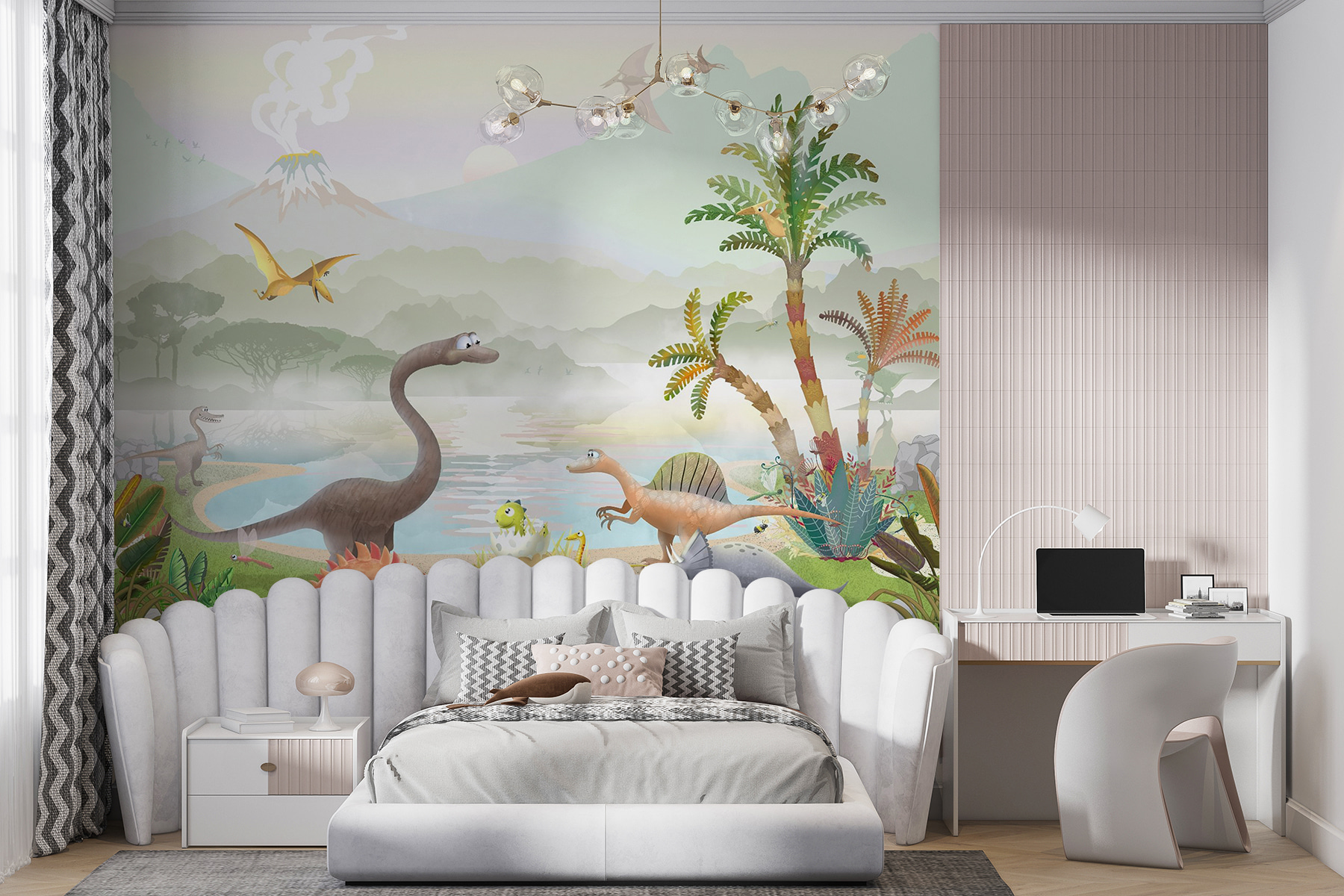 Szukasz czegoś, co sprawi, że pokój dziecka będzie pełen emocji? Sprawdź tę uroczą fototapetę przedstawiającą pterodaktyla latającego wysoko nad kreskówkowym światem dinozaurów. Wyobraź to sobie: żywe dinozaury wędrujące dookoła, bujne prehistoryczne rośliny i parujący wulkan w tle – to jak wejście do kolorowego wehikułu czasu! Dzieci pokochają wskazywanie swoich ulubionych dinozaurów i udawanie, że latają razem z pterodaktylem. Jest idealny do pobudzania wyobraźni i dodawania zabawnych kolorów do każdego pokoju. Będziesz najfajniejszym rodzicem w okolicy!