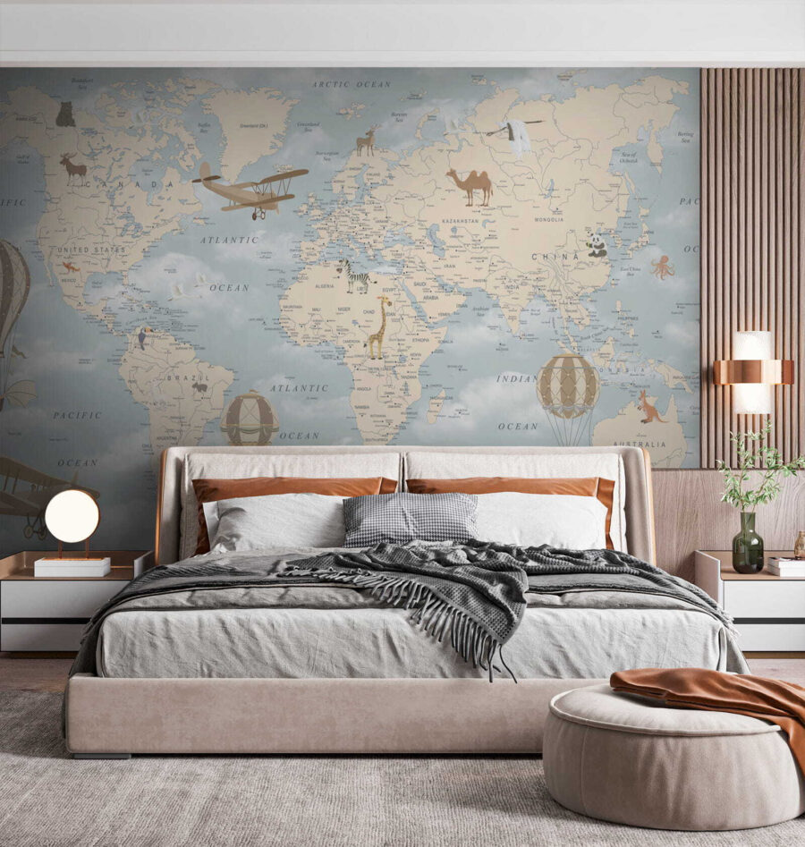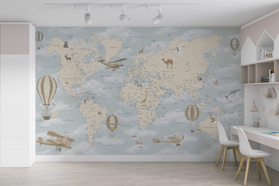 Wyobraź sobie, że wchodzisz do pokoju dziecięcego i wita Cię urocza fototapeta przedstawiająca balony na ogrzane powietrze dryfujące spokojnie nad pastelową mapą świata. To jak podróż dookoła świata w zaciszu własnego domu. Idealna do rozbudzania ciekawości i marzeń, ta fototapeta jest pełna kapryśnych szczegółów – zabawnych zwierząt, zabytkowych samolotów i oczywiście tych marzycielskich balonów na ogrzane powietrze unoszących się wysoko nad oceanami i kontynentami, jakby były w swojej własnej małej przygodzie.