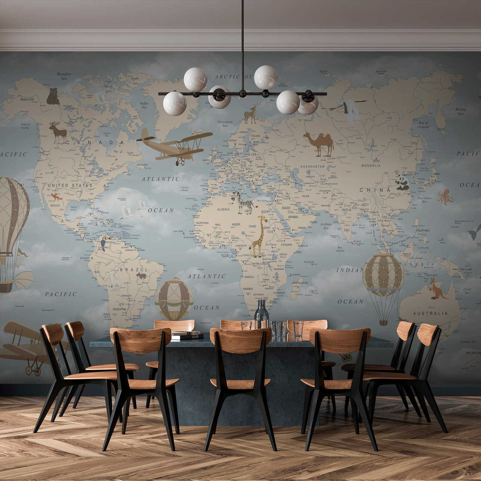 Wyobraź sobie, że wchodzisz do pokoju dziecięcego i wita Cię urocza fototapeta przedstawiająca balony na ogrzane powietrze dryfujące spokojnie nad pastelową mapą świata. To jak podróż dookoła świata w zaciszu własnego domu. Idealna do rozbudzania ciekawości i marzeń, ta fototapeta jest pełna kapryśnych szczegółów – zabawnych zwierząt, zabytkowych samolotów i oczywiście tych marzycielskich balonów na ogrzane powietrze unoszących się wysoko nad oceanami i kontynentami, jakby były w swojej własnej małej przygodzie.