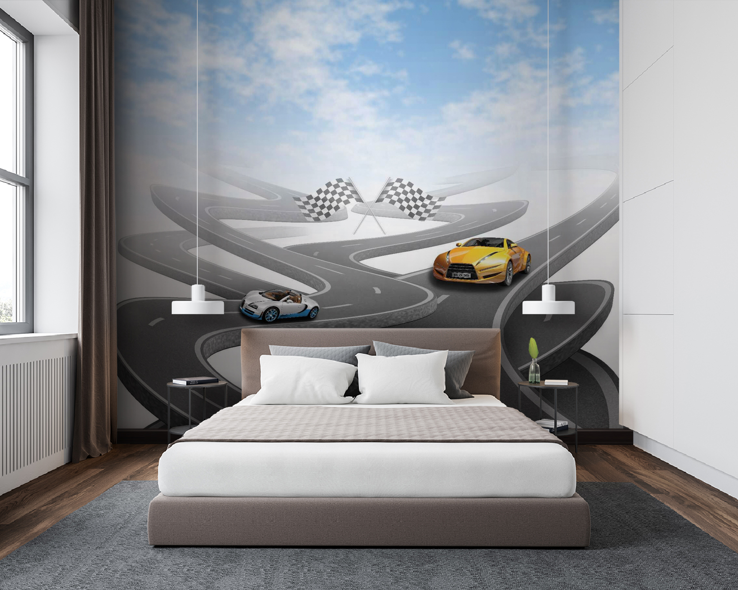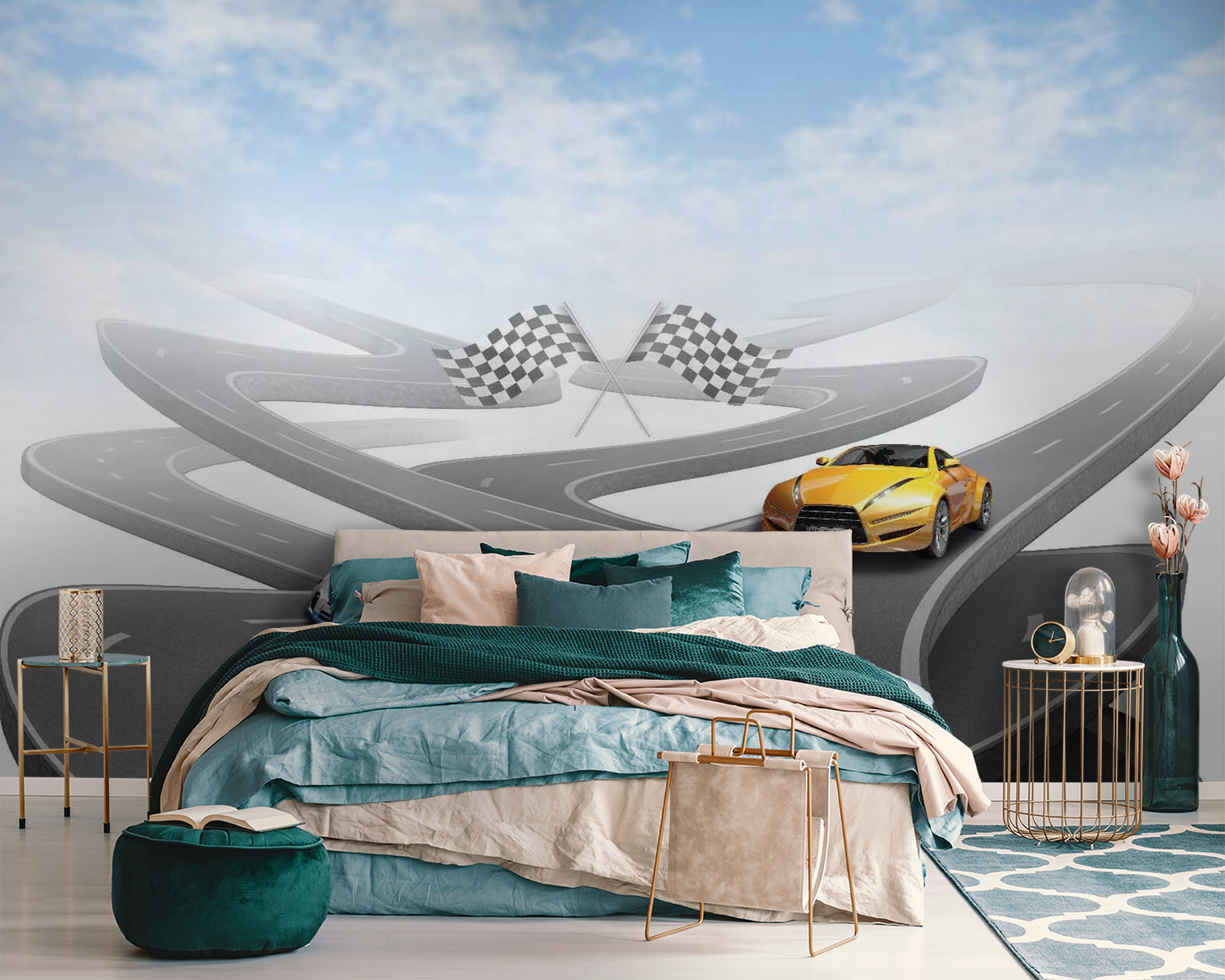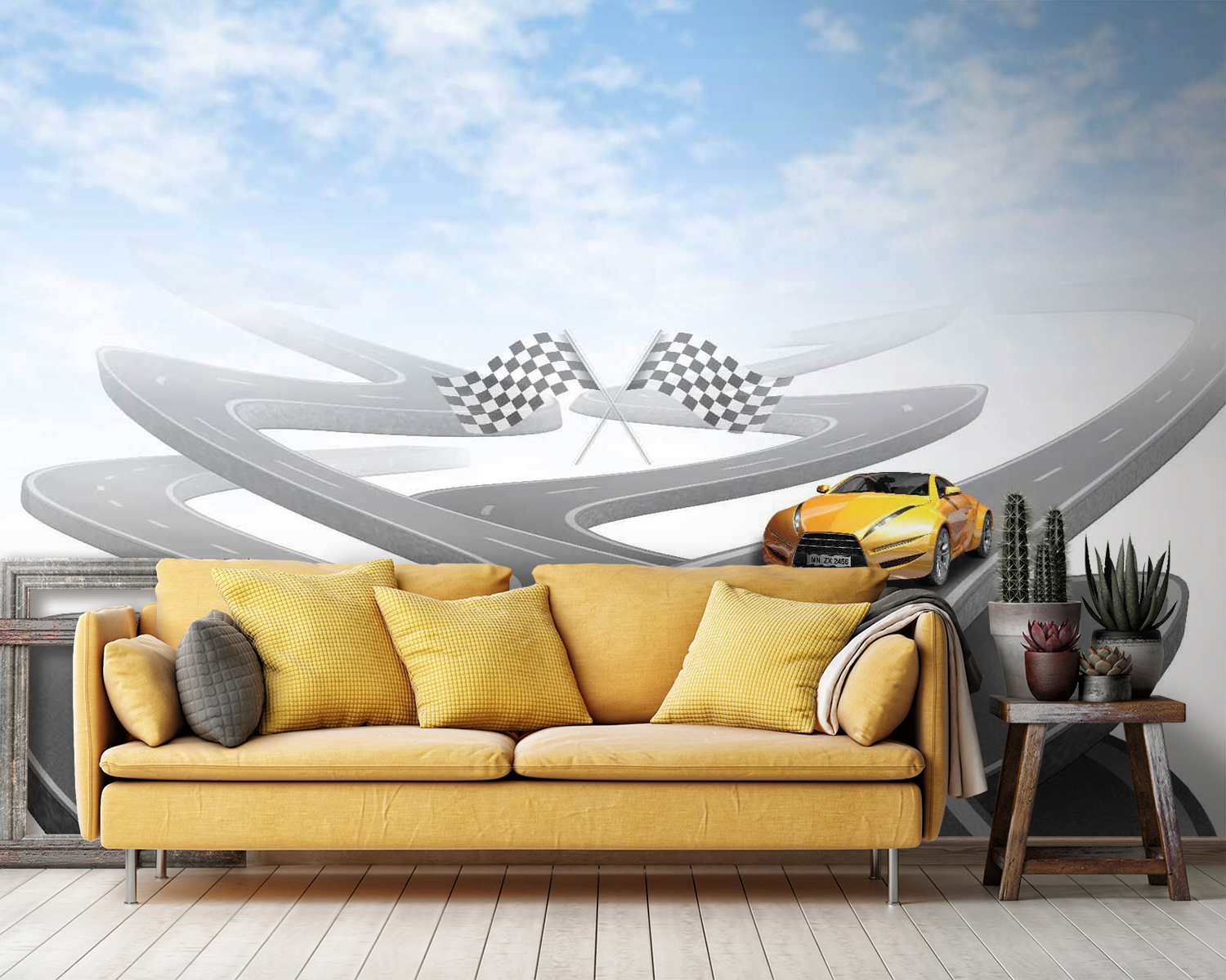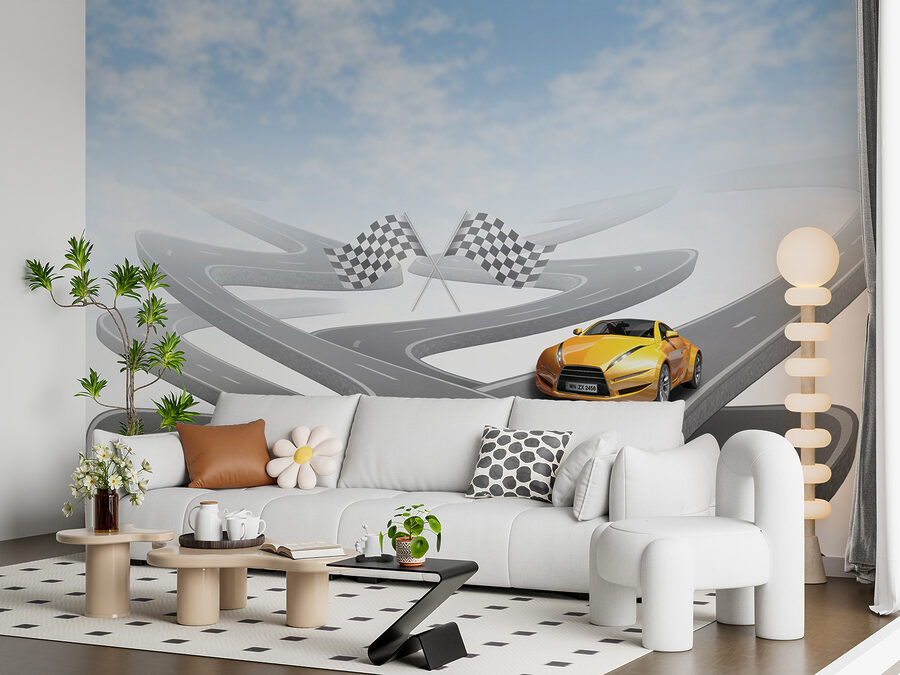Czy kiedykolwiek marzyłeś o tym, aby pędzić po krętych drogach w efektownym sportowym samochodzie? Ta fototapeta ścienna jest dla ciebie! Jasnożółty samochód sportowy na pozornie niekończącej się, krętej drodze pod niebem tak błękitnym, że może sprawić, że twoje ściany ożyją. Idealna dla entuzjastów samochodów, dzieci marzących o wyścigowych przygodach lub każdego, kto uwielbia odrobinę emocji w swoim wystroju. Wyobraź sobie historie, które możesz snuć, takie jak wyścigi przez góry lub rejsy po nadmorskich autostradach z wiatrem we włosach. To jak mini ucieczka, prosto na twoją ścianę!