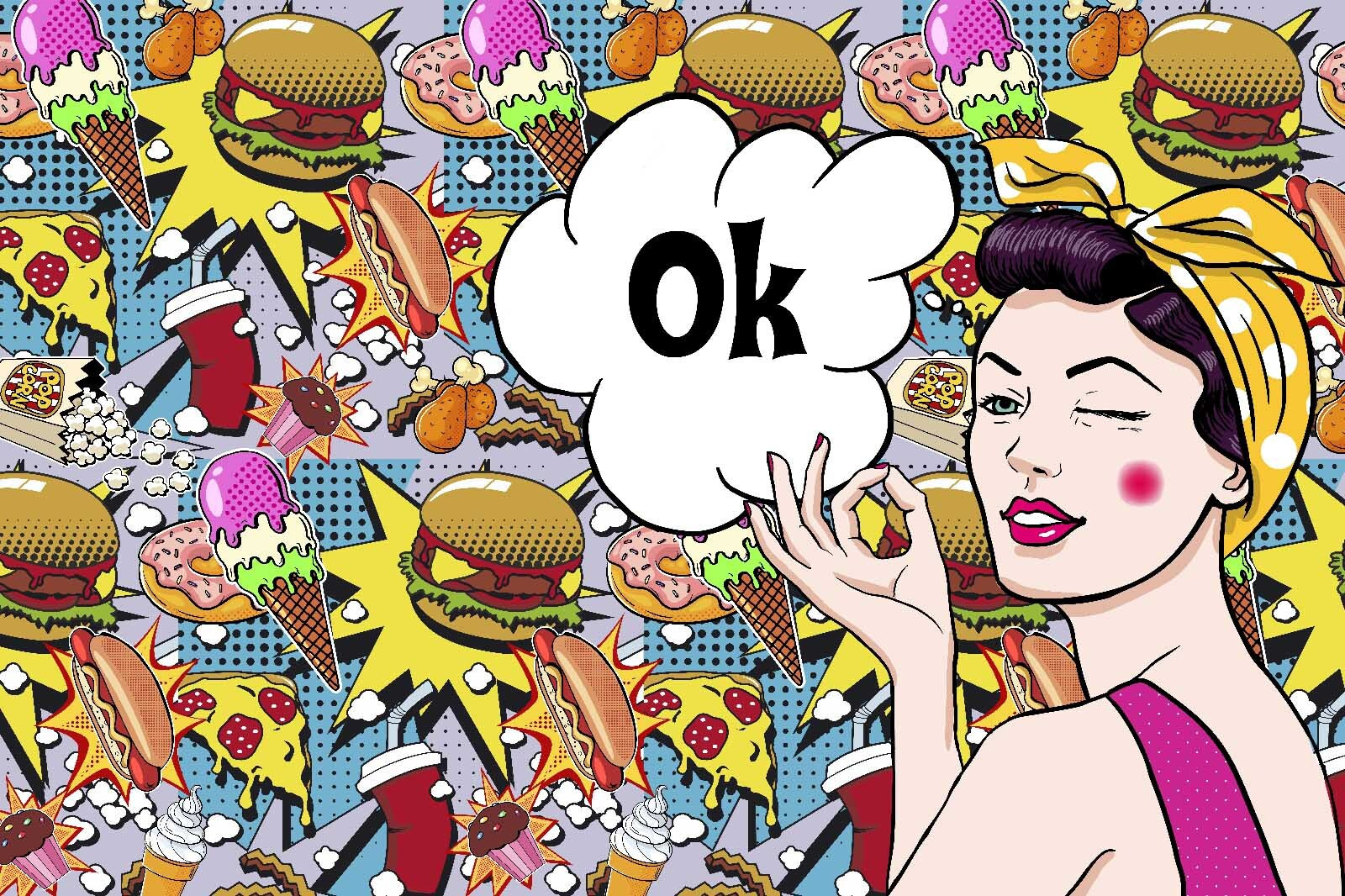 Dive into a world where culinary delights meet playful art with this vibrant mural! Picture a stylish woman winking at you as she presents a bubble that’s bursting with mouthwatering goodies—burgers, pizzas, and ice creams galore. It’s like a whimsical feast right on your wall! Perfect for a kitchen or dining area, this piece isn’t just decor; it’s an invitation to feast your eyes and spark conversations. Imagine guests chuckling as they enjoy their meals, all while being surrounded by such quirky charm. This mural’s got personality, just like that friend who always brings the snacks!