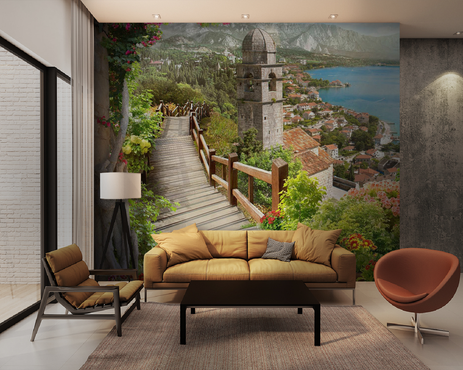 Imagine stepping into a dreamy escape every time you glance at your wall. This “Stairway Leading to a Town” mural whispers tales of sunlit strolls through vibrant gardens, with flowers just begging to be admired. The soft wooden path leads you through a charming village, where cobblestone streets and colorful rooftops gently tug at your imagination. Maybe you can almost hear the laughter of children or the distant sound of waves lapping at the shore. It’s a slice of paradise right in your home. Transform your space with this mural, and let it carry you away, even if just for a moment—it’s the perfect conversation starter for those lazy Sundays with friends. Suitable for all nature lovers and daydreamers, this piece adds warmth and life to any room.