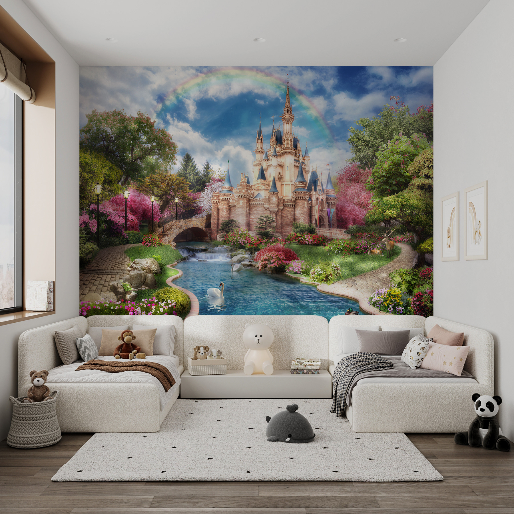 Wyobraź sobie, że wkraczasz do bajki z fototapetą ścienną “Zamek z tęczą na niebie”. Wyobraź sobie uroczy zamek położony pośród kwitnących drzew, spokojny staw i tak, świecącą tęczę rozciągającą się na niebie – nadając każdemu pomieszczeniu magiczny charakter. Idealna do pokoju córki lub każdej dziecięcej przystani, ta fototapeta przekształca ściany w senną ucieczkę, w której wyobraźnia może szaleć. Kto potrzebuje bajek na dobranoc, gdy przygoda jest na ścianie? Spokojna ścieżka ogrodowa, łabędzie pływające po wodzie i zamek emanujący czarem – to jak własne okno do świata fantazji. Wyobraź sobie, jak maluchy zasypiają, śniąc o magicznych krainach i epickich wyprawach.