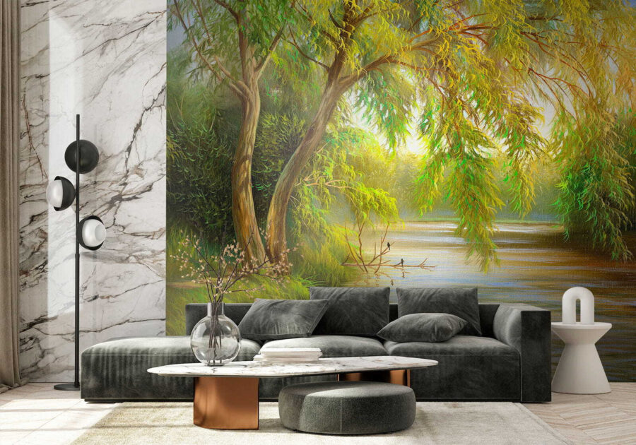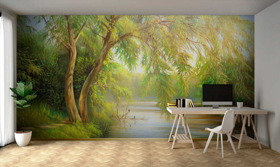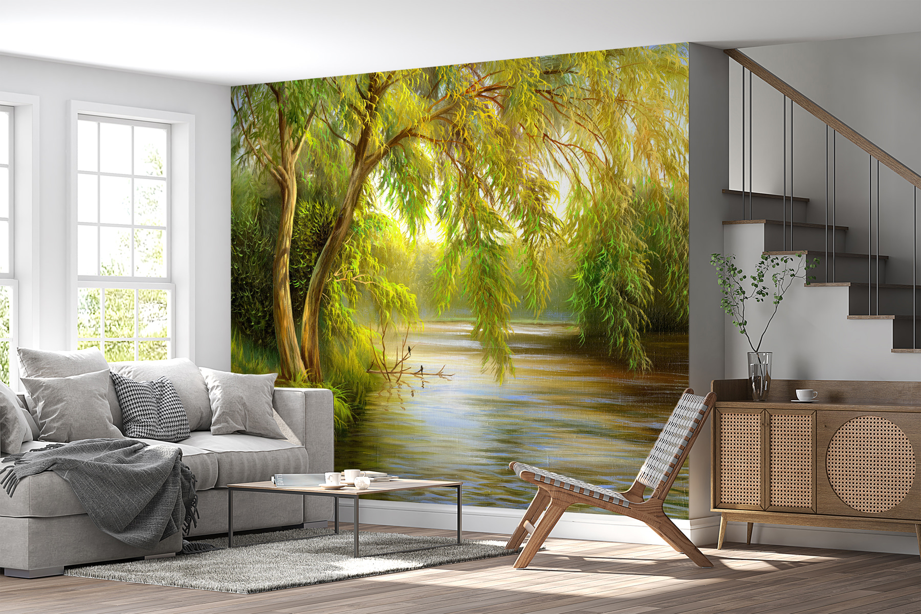 Przekształć swoją przestrzeń za pomocą fototapety, która sprawi, że poczujesz się jak na łonie natury. Ten czarujący wzór przedstawia spokojne drzewo ozdobione bujną zielenią i ciepłymi żółtymi liśćmi, doskonale oddając blask złotej godziny. Wyobraź sobie wylegiwanie się w swoim salonie, popijając herbatę, podczas gdy ta fototapeta szepcze historie o wspaniałych plenerach. To jak posiadanie mini-lasu bezpośrednio na ścianie, wnoszącego cały ten orzeźwiający klimat bez żadnych robaków! Niezależnie od tego, czy jest to przytulny kącik, czy jasne biuro, ten element zachęca do spokoju i inspiracji. Nie zdziw się, jeśli sprawi, że będziesz chciał założyć ogród!