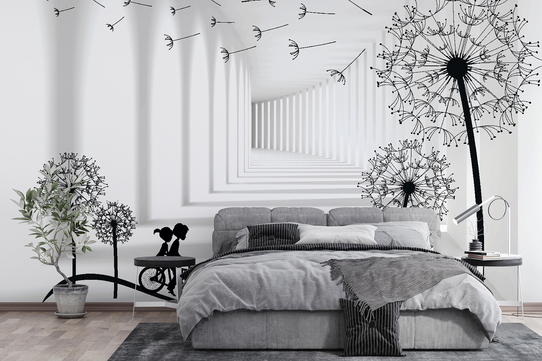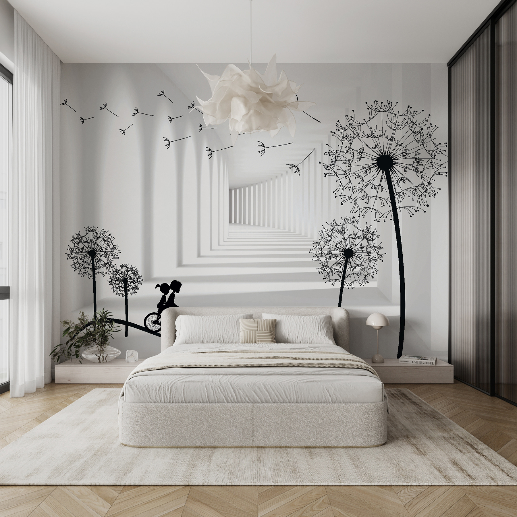 Odmień swoją przestrzeń dzięki tej kapryśnej fototapecie przedstawiającej chłopca i dziewczynkę jadących na rowerze przez senny krajobraz mniszka lekarskiego. Zabawne sylwetki zachęcają do poczucia wolności i przygody, przywołując wspomnienia beztroskich dni dzieciństwa i słonecznych przejażdżek. Wyobraź sobie, że budzisz się każdego ranka, mile zaskoczony tą radosną sceną, która dodaje uroku Twoim ścianom. To jak wprowadzenie odrobiny nostalgii do swojego domu. Idealna do salonu, pokoju zabaw, a nawet małego kącika do czytania – ta fototapeta to nie tylko dekoracja, to czarująca podróż, która czeka, aby się wydarzyć!