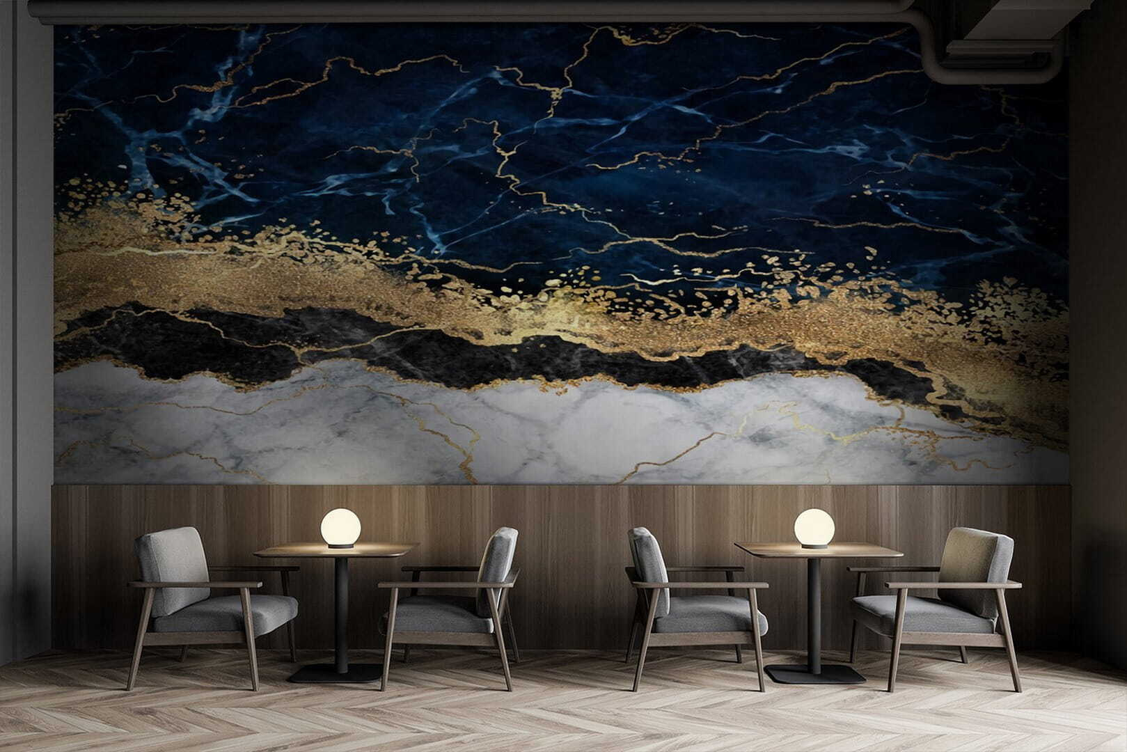 Przekształć nudną ścianę w coś naprawdę urzekającego dzięki tej fototapecie Midnight Marbled with Shimmering Veins. Wyobraź sobie, że wchodzisz do pokoju, w którym głębokie błękity wirują razem jak morze o północy, a żyły wydają się pulsować i tańczyć. To tak, jakbyś miał kawałek natury owinięty wokół swojej przestrzeni, przynoszący kojącą, ale uderzającą atmosferę.