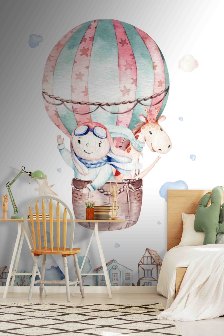 Add a sprinkle of whimsy to any space with this charming wall mural featuring a delightful watercolor scene: a cheerful person floating in a hot air balloon alongside a friendly unicorn. Imagine the smiles this mural could bring, evoking dreams of adventure and a bit of nostalgia. It’s the perfect conversation starter, painting joy on anyone’s wall. Picture a cozy nook; maybe a child’s room, or even a playful corner in a café. Every time someone walks by, they’ll be greeted with warmth and a hint of magic—because who doesn’t love a unicorn? Turn that wall into a story. Make it fun, let the colors dance, and bring a little happiness home!