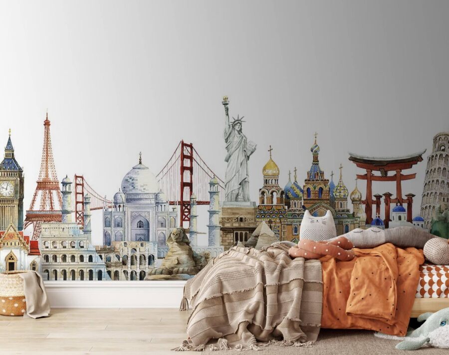 Przekształć pustą ścianę w wymarzoną ucieczkę dzięki tej żywej akwareli przedstawiającej kultowe punkty orientacyjne. Wyobraź sobie, że popijasz kawę, patrząc na Wieżę Eiffla lub marzysz o Tadż Mahal – ta fototapeta zaprasza każdego gościa do odkrywania cudów świata z domu. Każde pociągnięcie pędzla oddaje ducha podróży, sprawiając, że poczujesz się jak mała przygoda w swoim salonie. Ta fototapeta to nie tylko dekoracja; ona pobudza historie i ciepłe wspomnienia. Idealna dla dusz wędrowców lub każdego, kto po prostu kocha dobrą wizualną ucztę – to jak otwarte zaproszenie do odkrywania!
