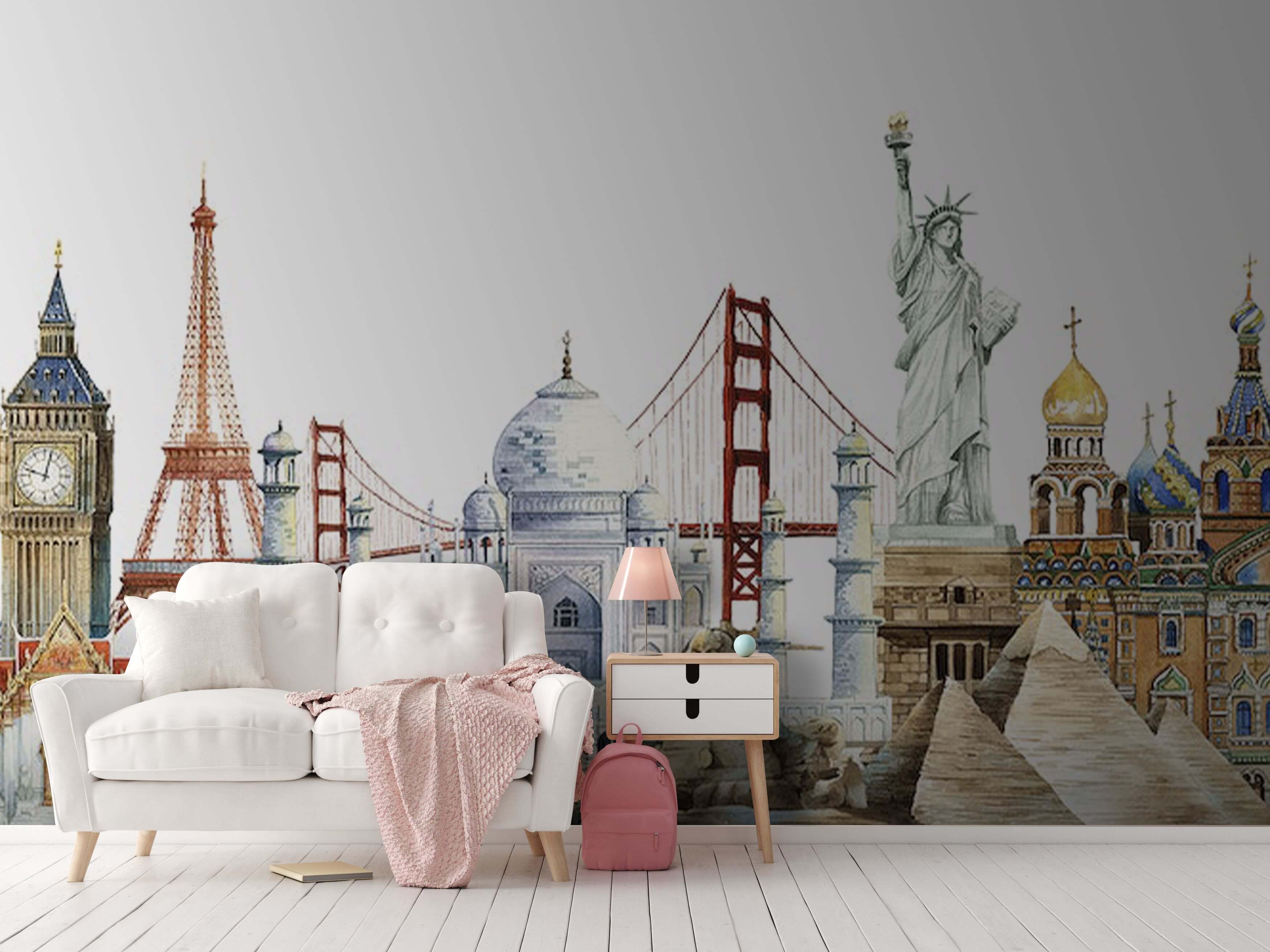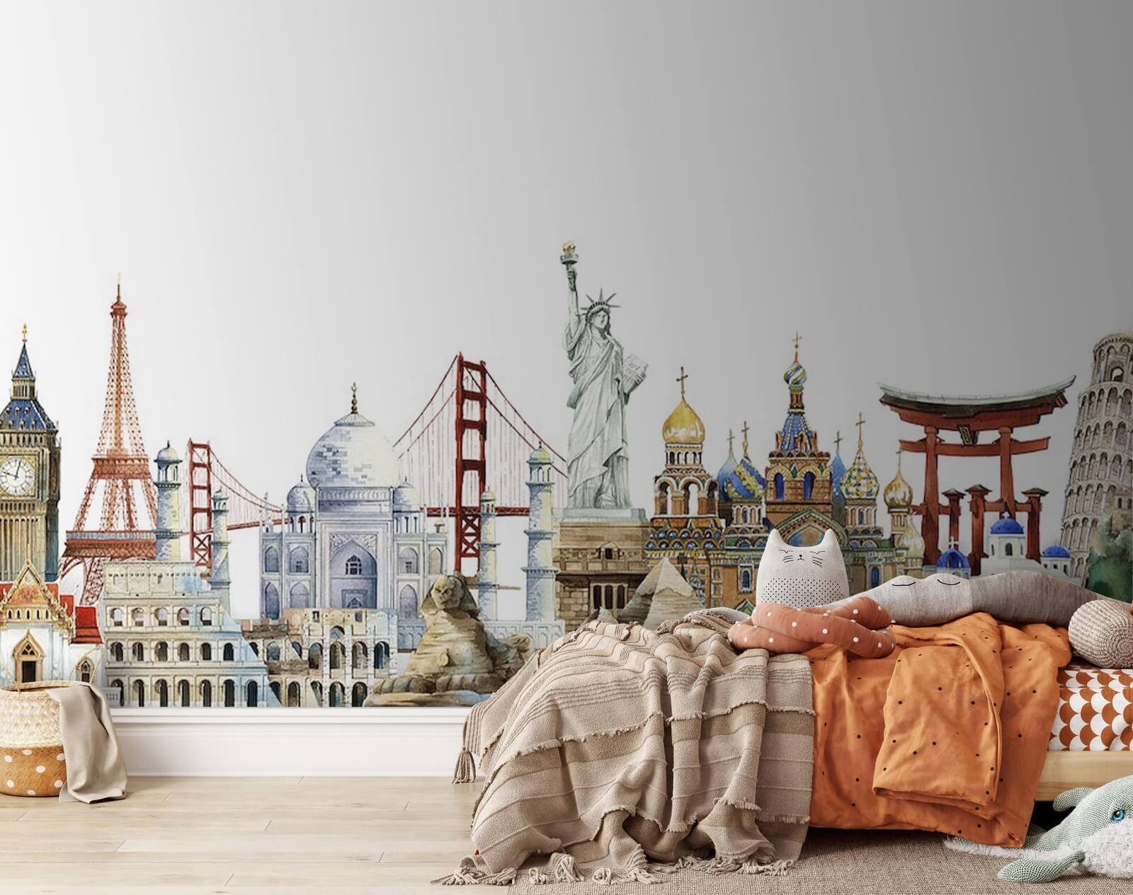 Przekształć pustą ścianę w wymarzoną ucieczkę dzięki tej żywej akwareli przedstawiającej kultowe punkty orientacyjne. Wyobraź sobie, że popijasz kawę, patrząc na Wieżę Eiffla lub marzysz o Tadż Mahal – ta fototapeta zaprasza każdego gościa do odkrywania cudów świata z domu. Każde pociągnięcie pędzla oddaje ducha podróży, sprawiając, że poczujesz się jak mała przygoda w swoim salonie. Ta fototapeta to nie tylko dekoracja; ona pobudza historie i ciepłe wspomnienia. Idealna dla dusz wędrowców lub każdego, kto po prostu kocha dobrą wizualną ucztę – to jak otwarte zaproszenie do odkrywania!